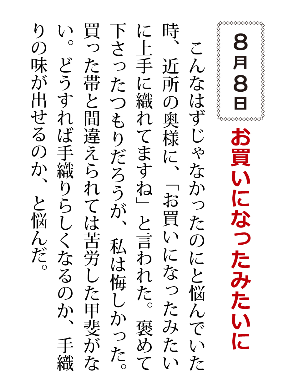 こんなはずじゃなかったのにと悩んでいた時、近所の奥様に、「お買いになったみたいに上手に織れてますね」と言われた。褒めて下さったつもりだろうが、私は悔しかった。買った帯と間違えられては苦労した甲斐がない。どうすれば手織りらしくなるのか、手織りの味が出せるのか、と悩んだ。