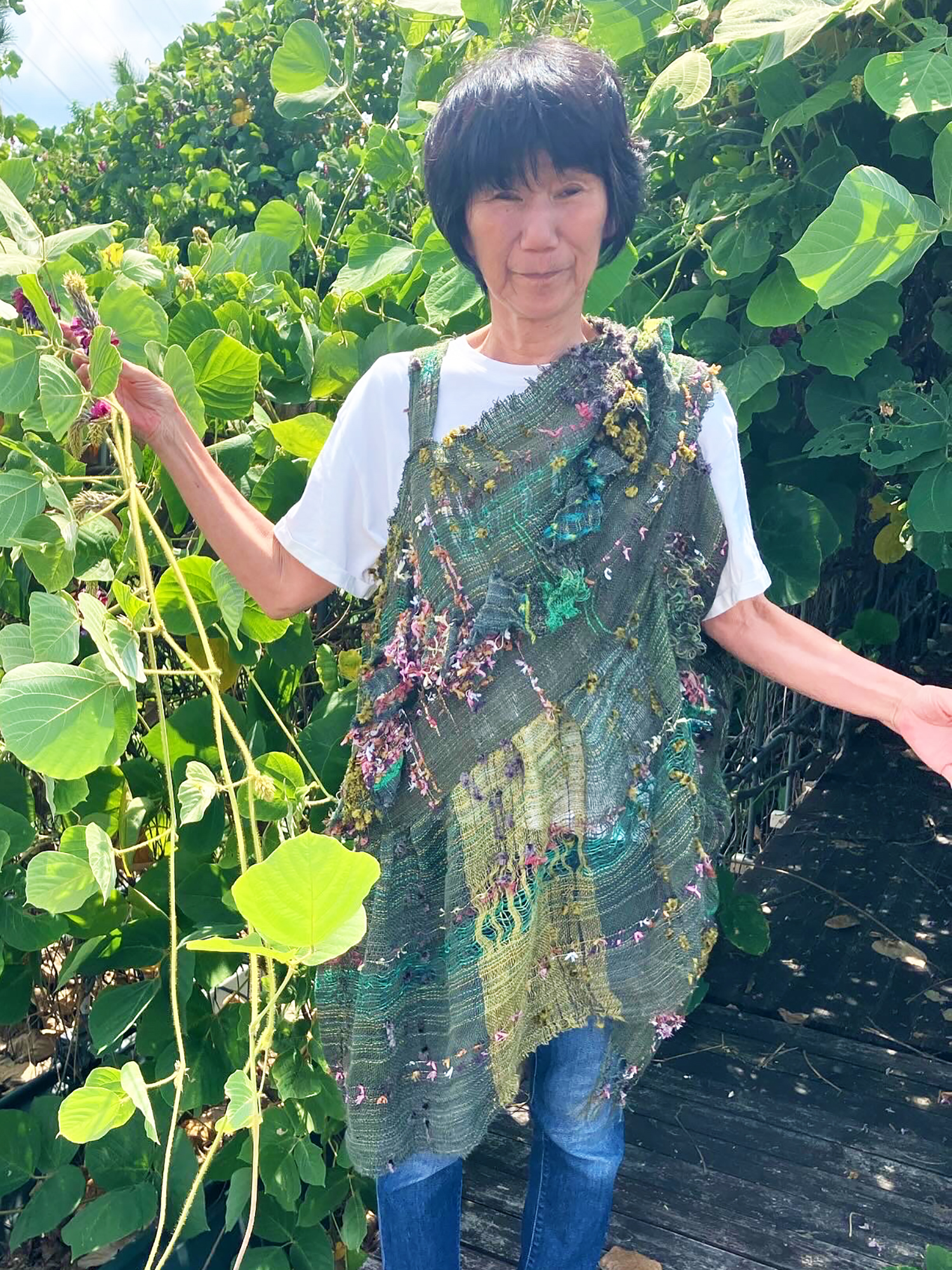 『背びれ織り』に挑戦した布を使って、お出かけ用にと、悩みつつ真剣にお仕立てされました。リネンを使った適度なハリのある布だったので、『背びれ織り』が効いています。