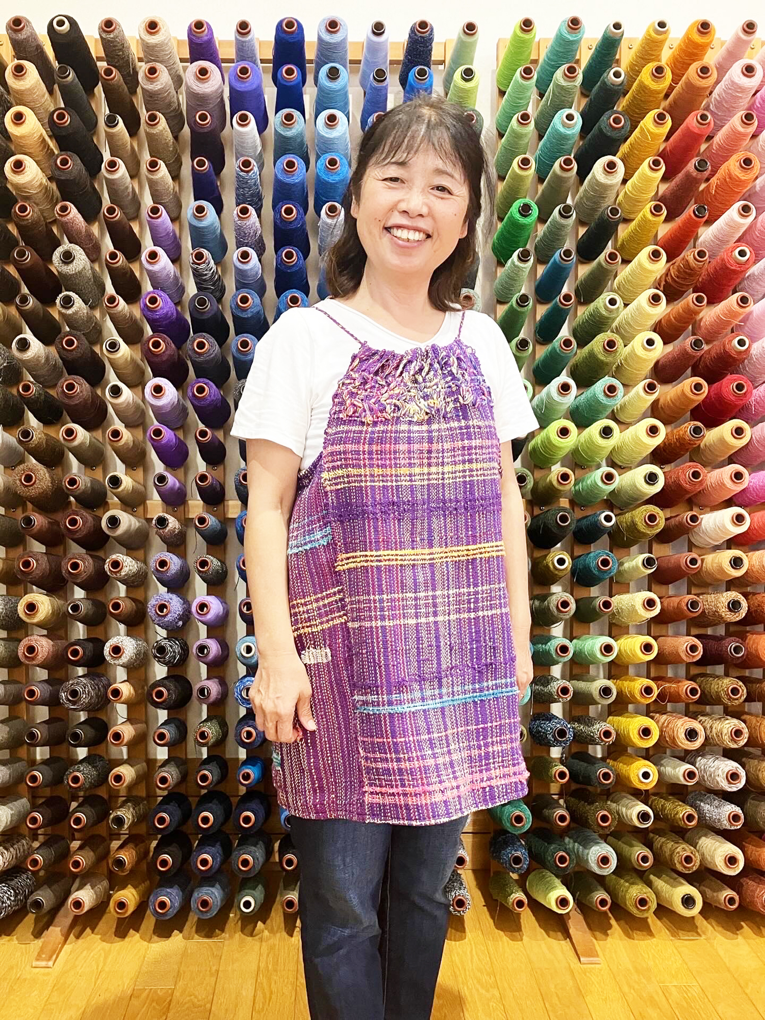 織り始めのタテ糸を折り返して織り込んでみたかったそうで、初挑戦されました。仕立てには、その部分を活かして素敵なチュニックに。