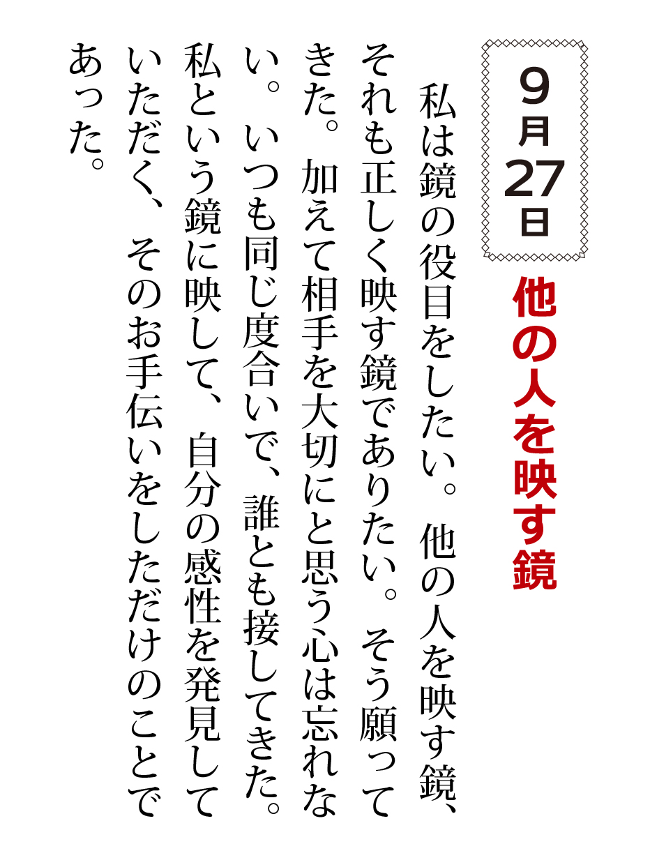 私は鏡の役目をしたい。他の人を映す鏡、それも正しく映す鏡でありたい。そう願ってきた。加えて相手を大切にと思う心は忘れない。いつも同じ度合いで、誰とも接してきた。私という鏡に映して、自分の感性を発見していただく、そのお手伝いをしただけのことであった。