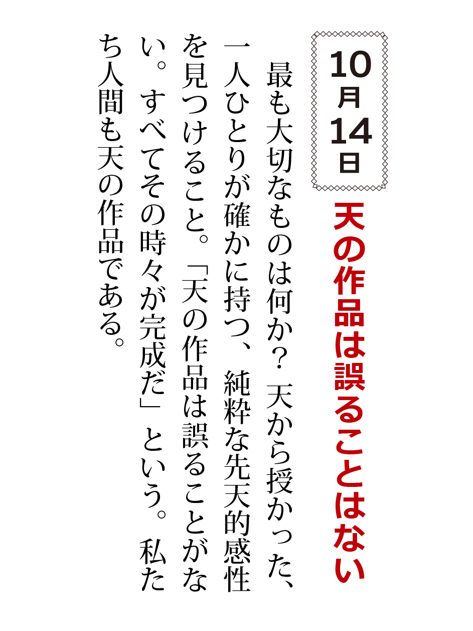 最も大切なものは何か?天から授かった、一人ひとりが確かに持つ、純粋な先天的感性を見つけること。「天の作品は誤ることがない。すべてその時々が完成だ」という。私たち人間も天の作品である。