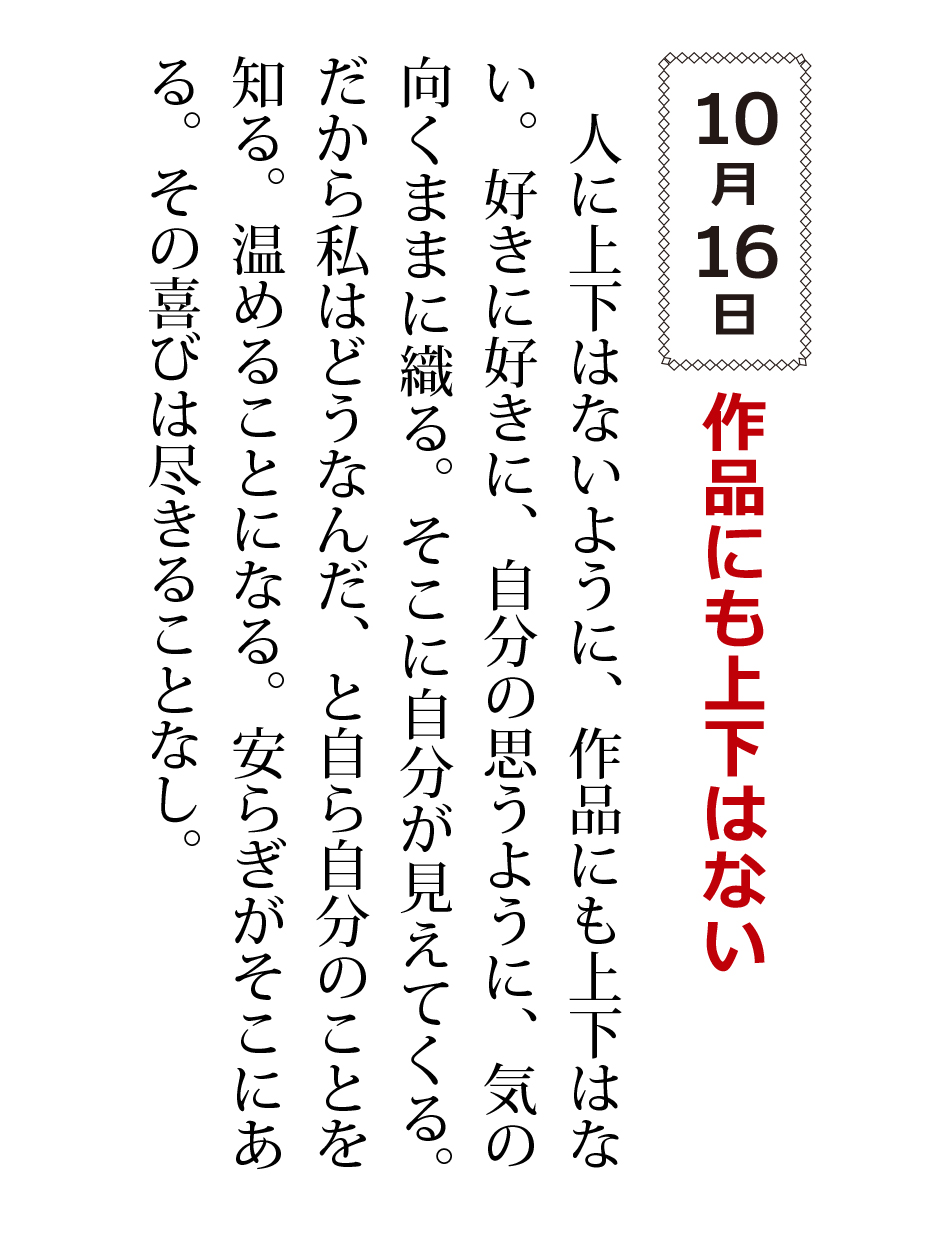 人に上下はないように、作品にも上下はない。好きに好きに、自分の思うように、気の向くままに織る。そこに自分が見えてくる。だから私はどうなんだ、と自ら自分のことを知る。温めることになる。安らぎがそこにある。その喜びは尽きることなし。