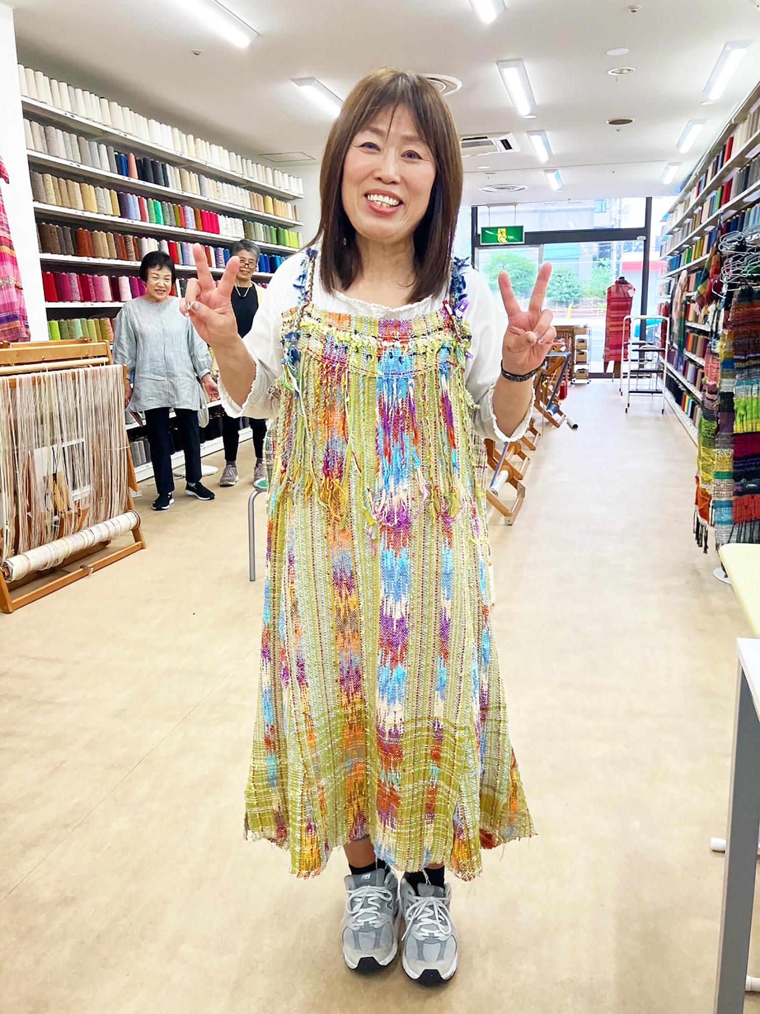 この夏初めて、段染めの糸を使って『円整経』(絣合わせ)でのタテ糸づくりにチャレンジされました。円整経した部分とそうでない部分との対比が印象的なワンピースになっています。