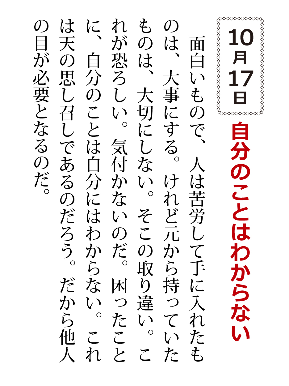 面白いもので、人は苦労して手に入れたものは、大事にする。けれど元から持っていたものは、大切にしない。そこの取り違い。これが恐ろしい。気付かないのだ。困ったことに、自分のことは自分にはわからない。これは天の思し召しであるのだろう。だから他人の目が必要となるのだ。