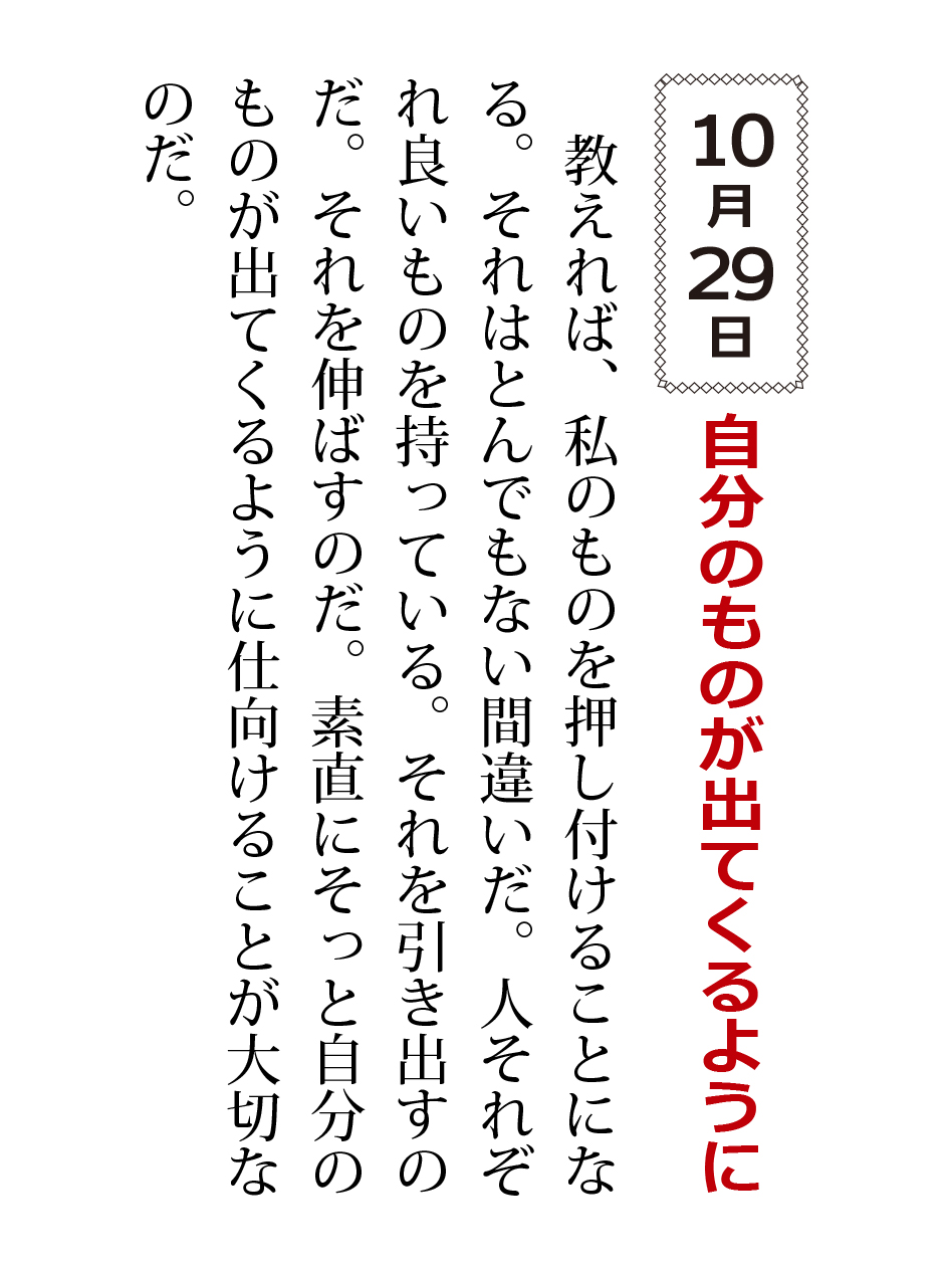 教えれば、私のものを押し付けることになる。それはとんでもない間違いだ。人それぞれ良いものを持っている。それを引き出すのだ。それを伸ばすのだ。素直にそっと自分のものが出てくるように仕向けることが大切なのだ。