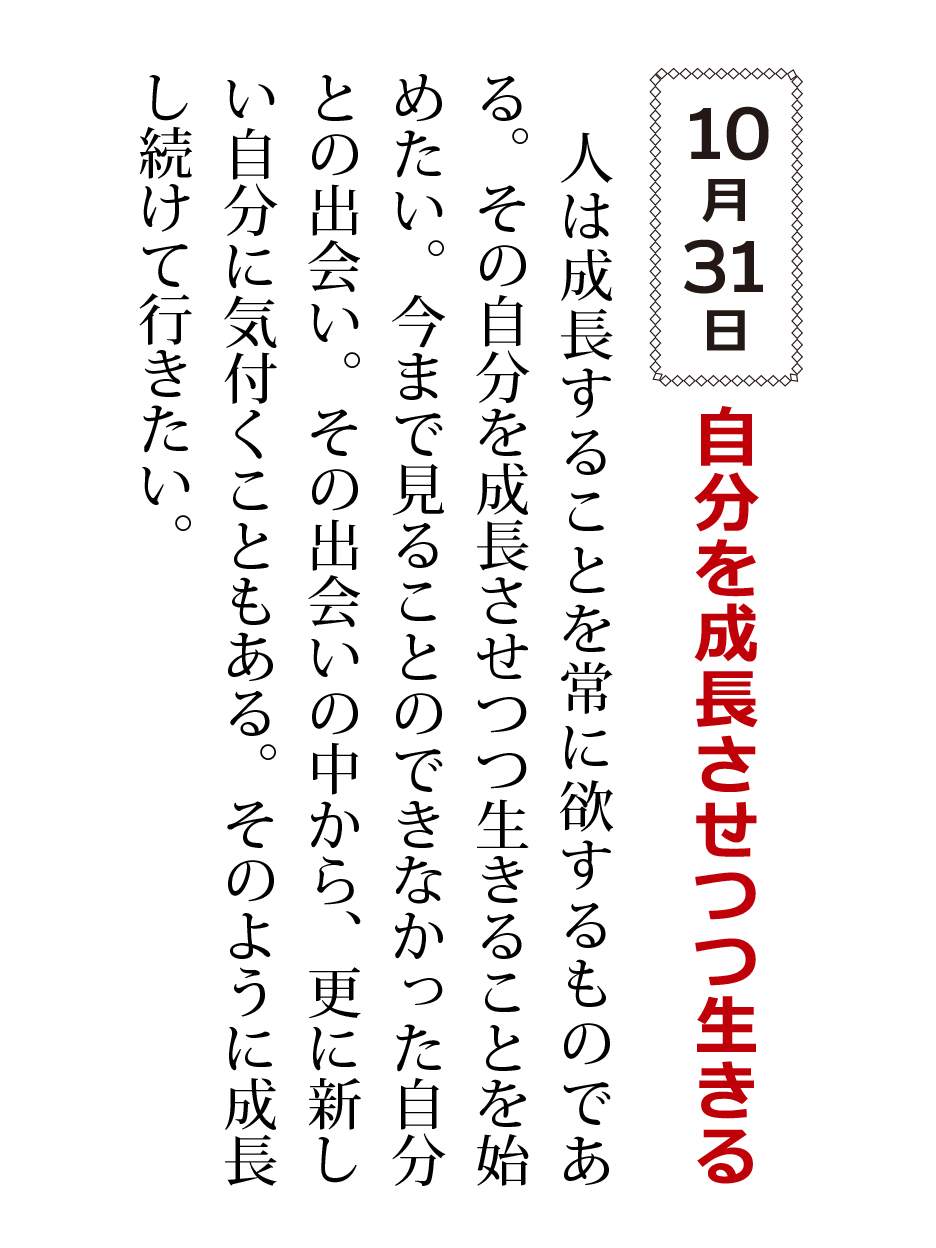 人は成長することを常に欲するものである。その自分を成長させつつ生きることを始めたい。今まで見ることのできなかった自分との出会い。その出会いの中から、更に新しい自分に気付くこともある。そのように成長し続けて行きたい。