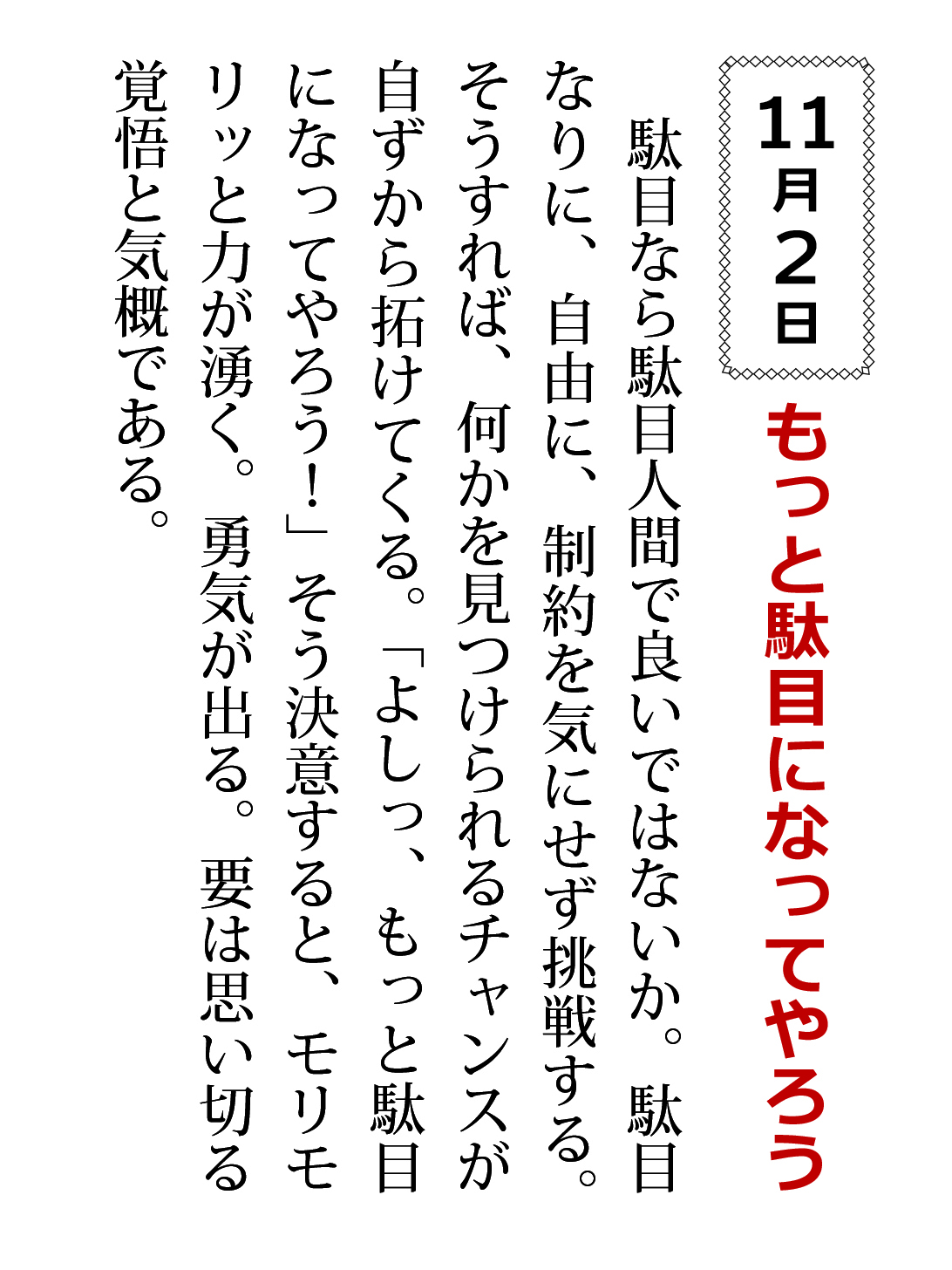 駄目なら駄目人間で良いではないか。駄目なりに、自由に、制約を気にせず挑戦する。そうすれば、何かを見つけられるチャンスが自ずから拓けてくる。「よしっ、もっと駄目になってやろう!」そう決意すると、モリモリッと力が湧く。勇気が出る。要は思い切る覚悟と気概である。