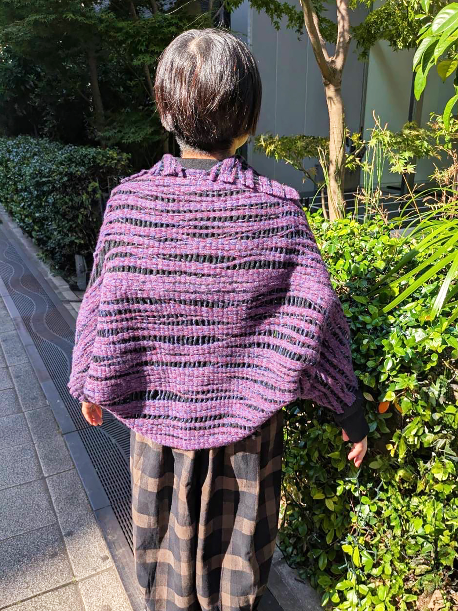 昨年ご購入の作品のオマージュで、粗々に。縮絨してみるまでどんな風に揺らぐのか予測できないところも面白がれる心の余裕。シンプルにさをり織りらしい楽しみ方がぎゅっと詰まった作品です。
