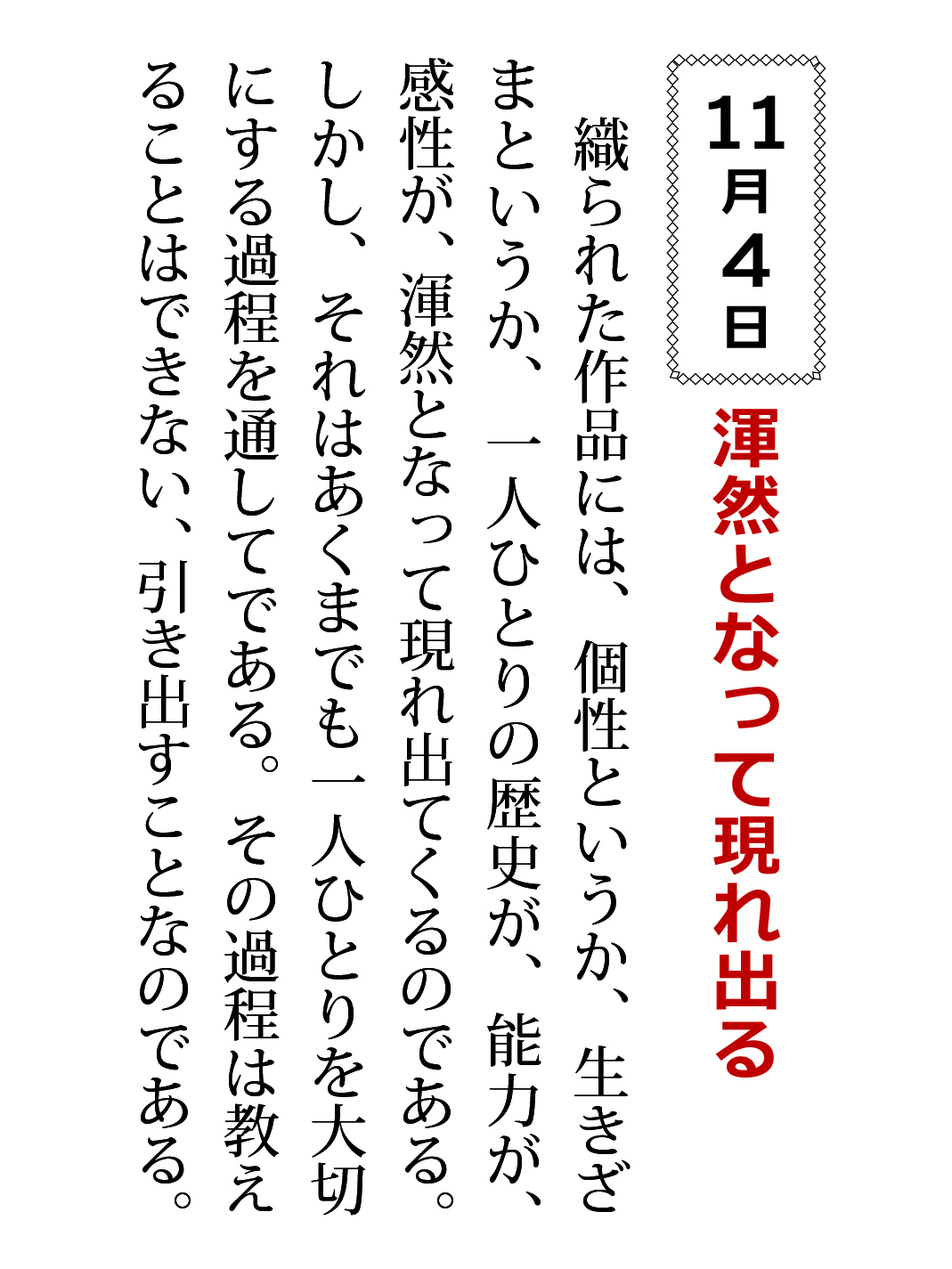 織られた作品には、個性というか、生きざまというか、一人ひとりの歴史が、能力が、感性が、渾然となって現れ出てくるのである。しかし、それはあくまでも一人ひとりを大切にする過程を通してである。その過程は教えることはできない、引き出すことなのである。