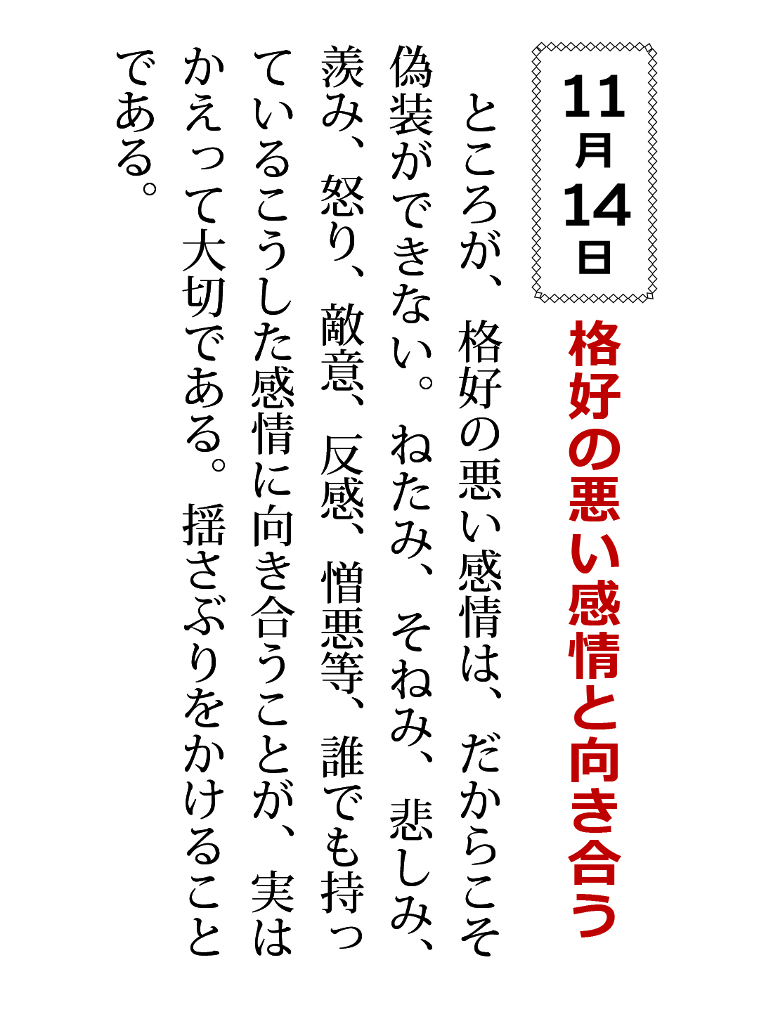 ところが、格好の悪い感情は、だからこそ偽装ができない。ねたみ、そねみ、悲しみ、羨み、怒り、敵意、反感、憎悪等、誰でも持っているこうした感情に向き合うことが、実はかえって大切である。揺さぶりをかけることである。