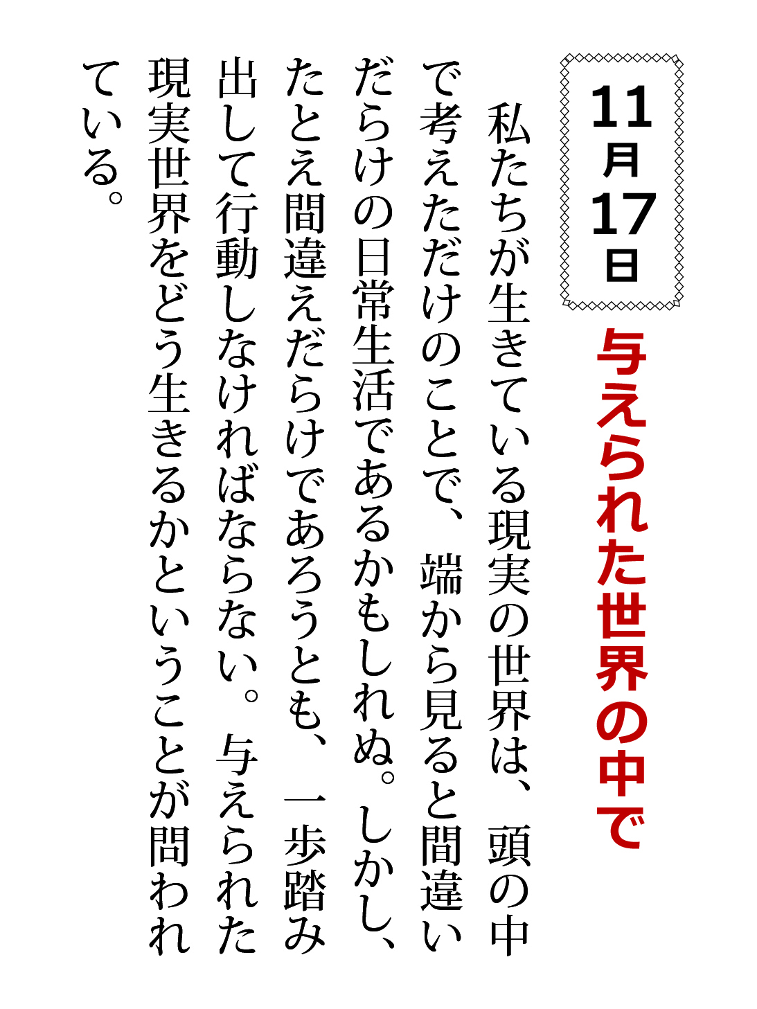 私たちが生きている現実の世界は、頭の中で考えただけのことで、端から見ると間違いだらけの日常生活であるかもしれぬ。しかし、たとえ間違えだらけであろうとも、一歩踏み出して行動しなければならない。与えられた現実世界をどう生きるかということが問われている。