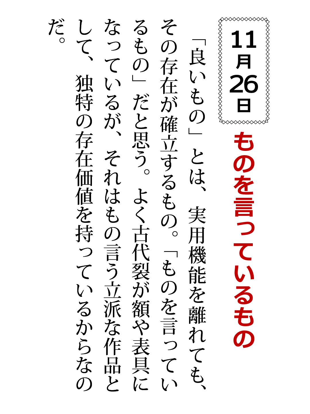 その存在が確立するもの。「ものを言っているもの」だと思う。よく古代裂が額や表具になっているが、それはもの言う立派な作品として、独特の存在価値を持っているからなのだ。