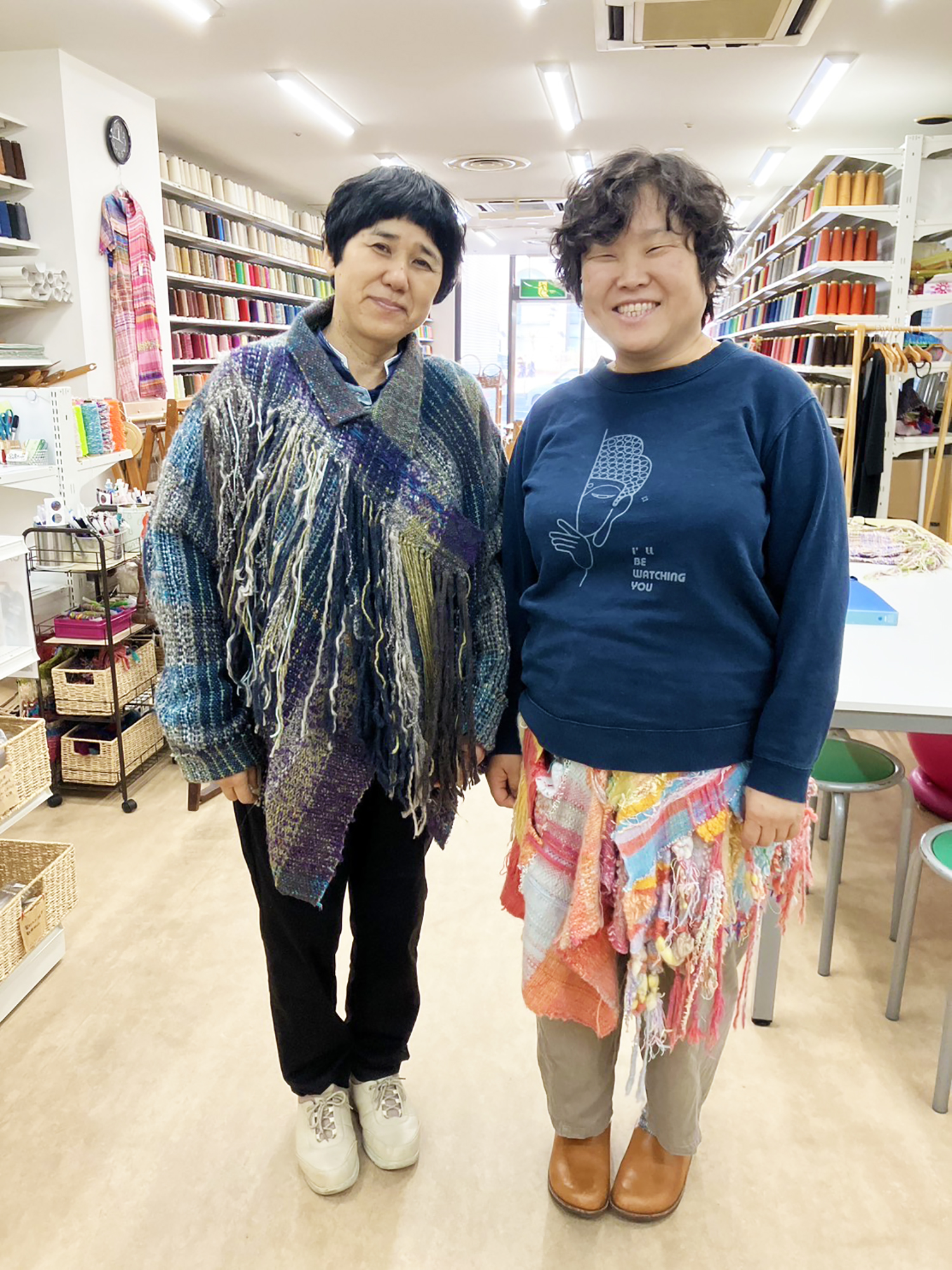 右の方は、ラムウールたっぷりのオーバースカートを仕立てられました。賑やかな春色で、身体も心も暖めてくれます。何度も着てお洗濯して、だんだんと風合いが変わっていくところもお気に入りポイントだそうです。