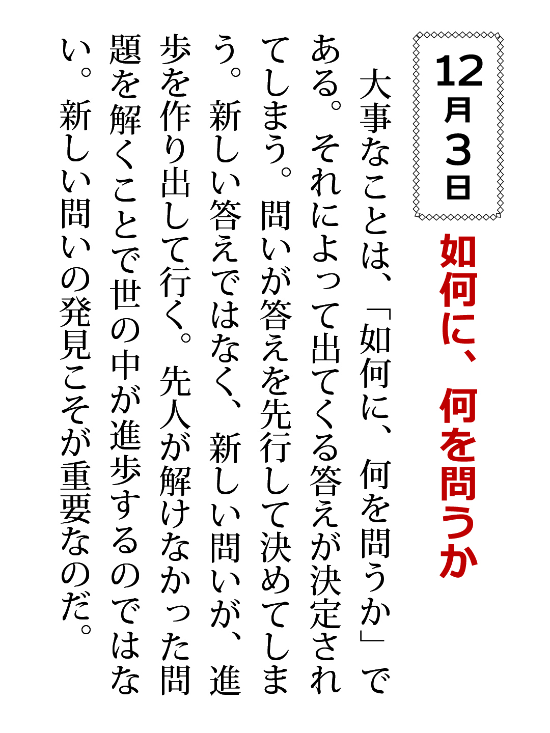 大事なことは、「如何に、何を問うか」である。それによって出てくる答えが決定されてしまう。問いが答えを先行して決めてしまう。新しい答えではなく、新しい問いが、進歩を作り出して行く。先人が解けなかった問題を解くことで世の中が進歩するのではない。新しい問いの発見こそが重要なのだ。