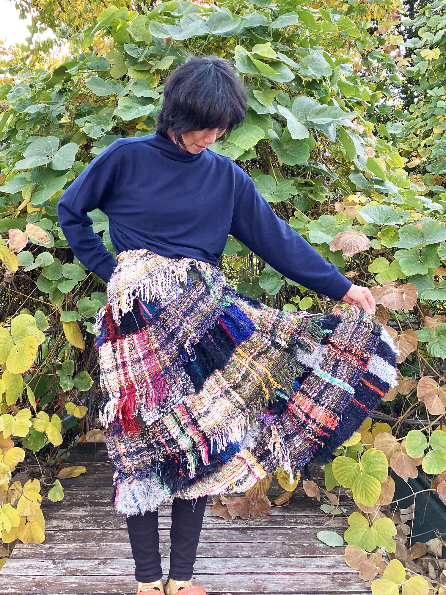 以前に仕立てられたものをリメイクして、『らせんスカート』に。 『耳出し織り』のひらひらも相まって、とても可愛らしく変身しました。
