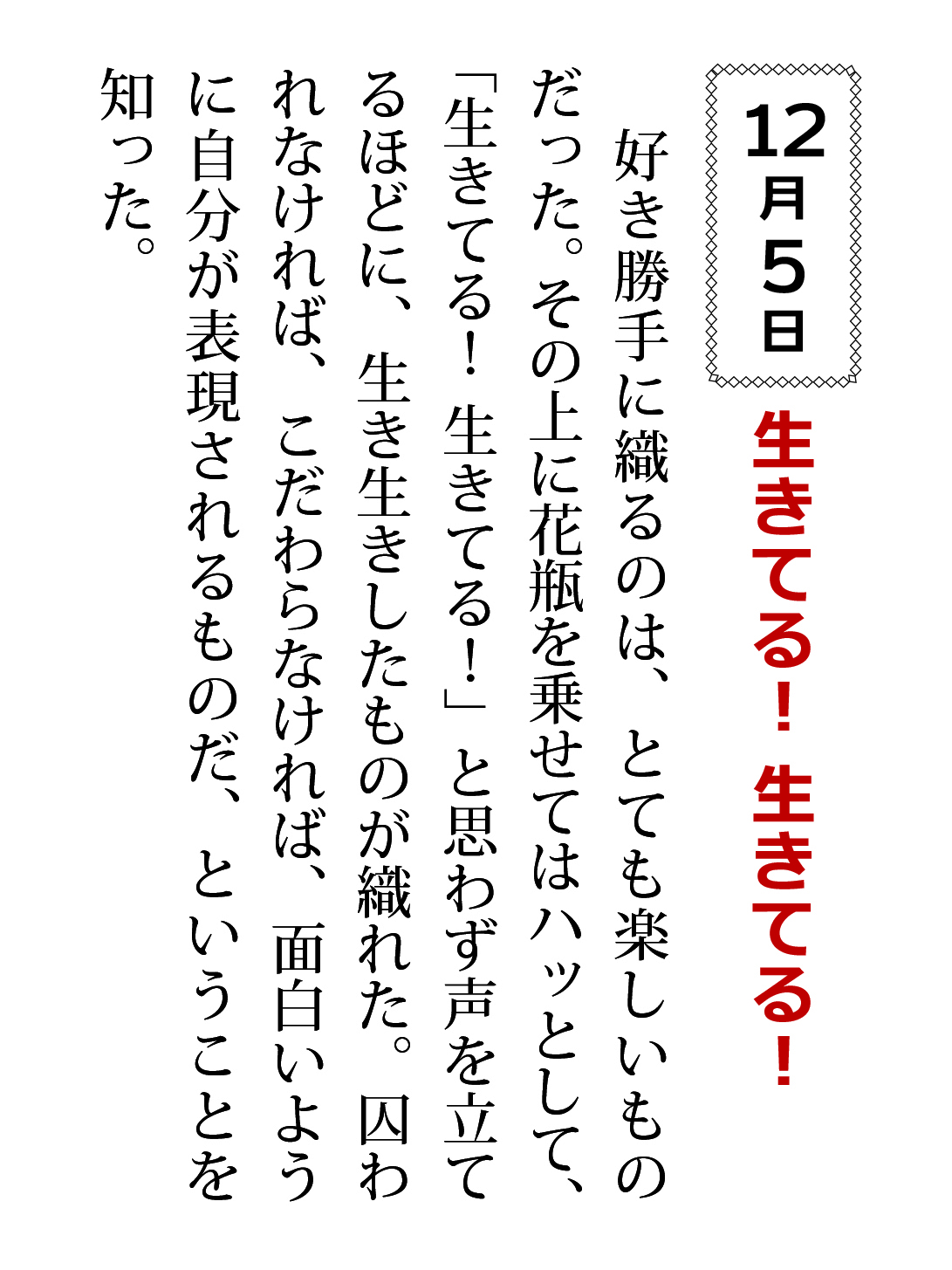 好き勝手に織るのは、とても楽しいものだった。その上に花瓶を乗せてはハッとして、「生きてる! 生きてる!」と思わず声を立てるほどに、生き生きしたものが織れた。囚われなければ、こだわらなければ、面白いように自分が表現されるものだ、ということを知った。
