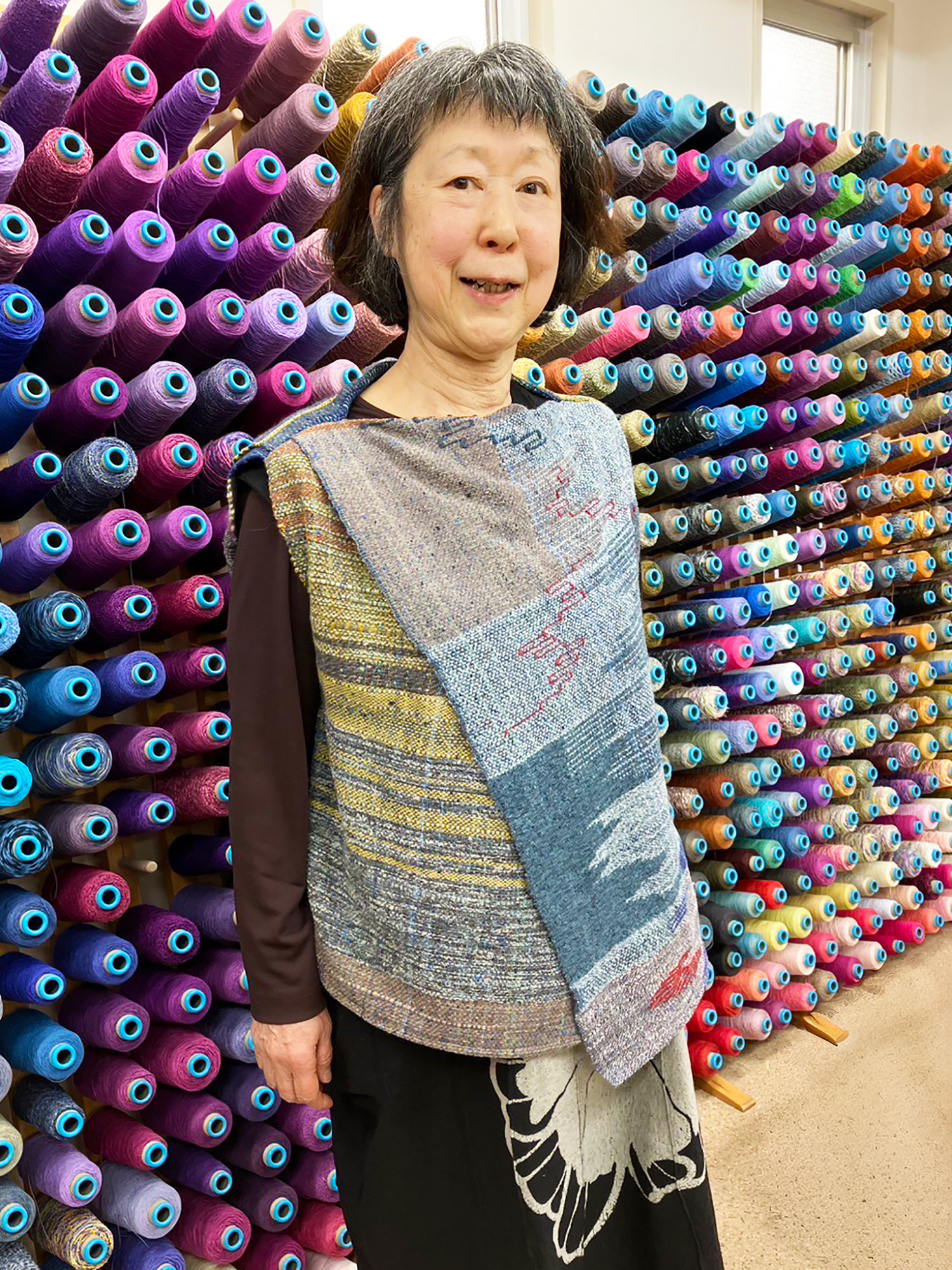 シンプルなベストですが、カリキュラム課題の織り技がたくさん入った布の個性が際立つ、とてもお似合いな一着となりました。