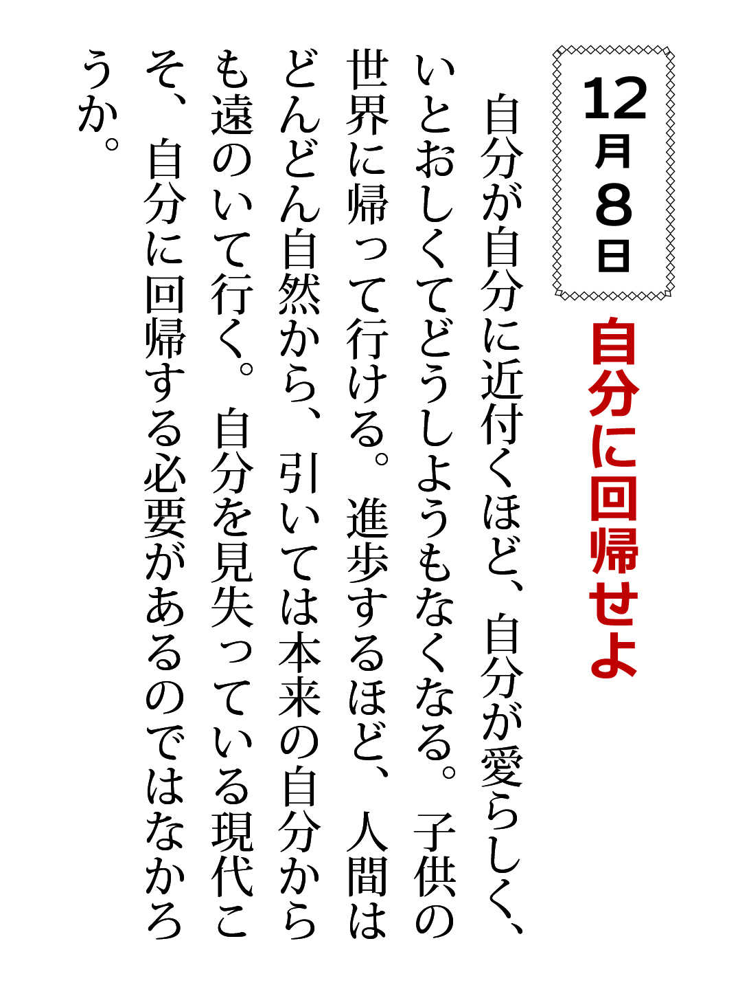 自分が自分に近付くほど、自分が愛らしく、いとおしくてどうしようもなくなる。子供の世界に帰って行ける。進歩するほど、人間はどんどん自然から、引いては本来の自分からも遠のいて行く。自分を見失っている現代こそ、自分に回帰する必要があるのではなかろうか。