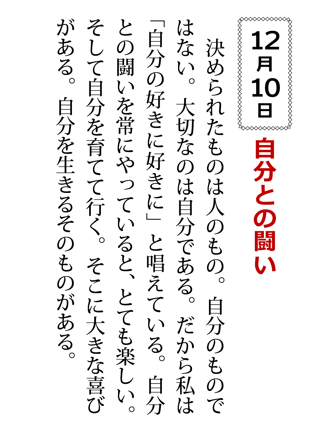 決められたものは人のもの。自分のものではない。大切なのは自分である。だから私は「自分の好きに好きに」と唱えている。自分との闘いを常にやっていると、とても楽しい。そして自分を育てて行く。そこに大きな喜びがある。自分を生きるそのものがある。