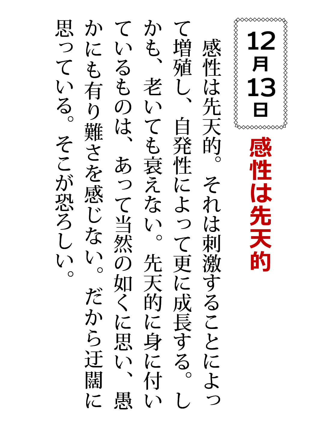 感性は先天的。それは刺激することによって増殖し、自発性によって更に成長する。しかも、老いても衰えない。先天的に身に付いているものは、あって当然の如くに思い、愚かにも有り難さを感じない。だから迂闊に思っている。そこが恐ろしい。