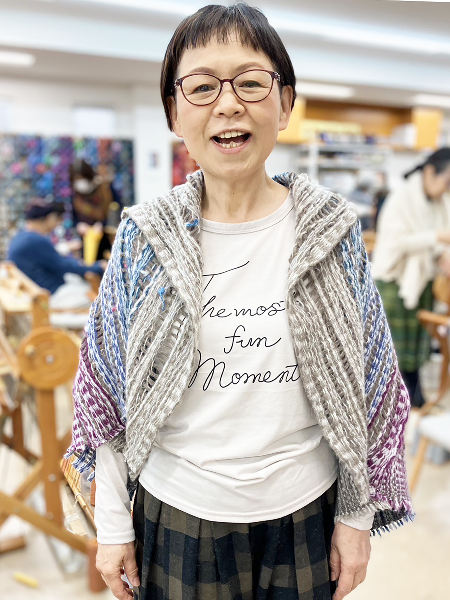 敢えて粗々に織って、縮絨によるタテ糸の揺らぎを最大限に活かしたお仕立てをということで、『マーガレット』のアレンジです。とってもシンプルなのに、布の味が際立つオススメのれ千駄ヶ谷の塾生さん。