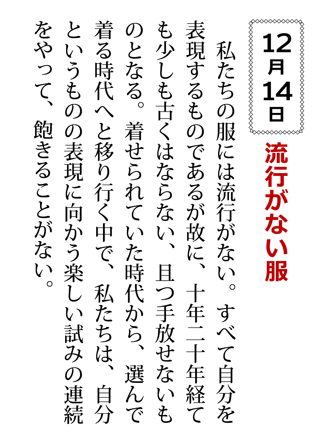 私たちの服には流行がない。すべて自分を表現するものであるが故に、十年二十年経ても少しも古くはならない、且つ手放せないものとなる。着せられていた時代から、選んで着る時代へと移り行く中で、私たちは、自分というものの表現に向かう楽しい試みの連続をやって、飽きることがない。