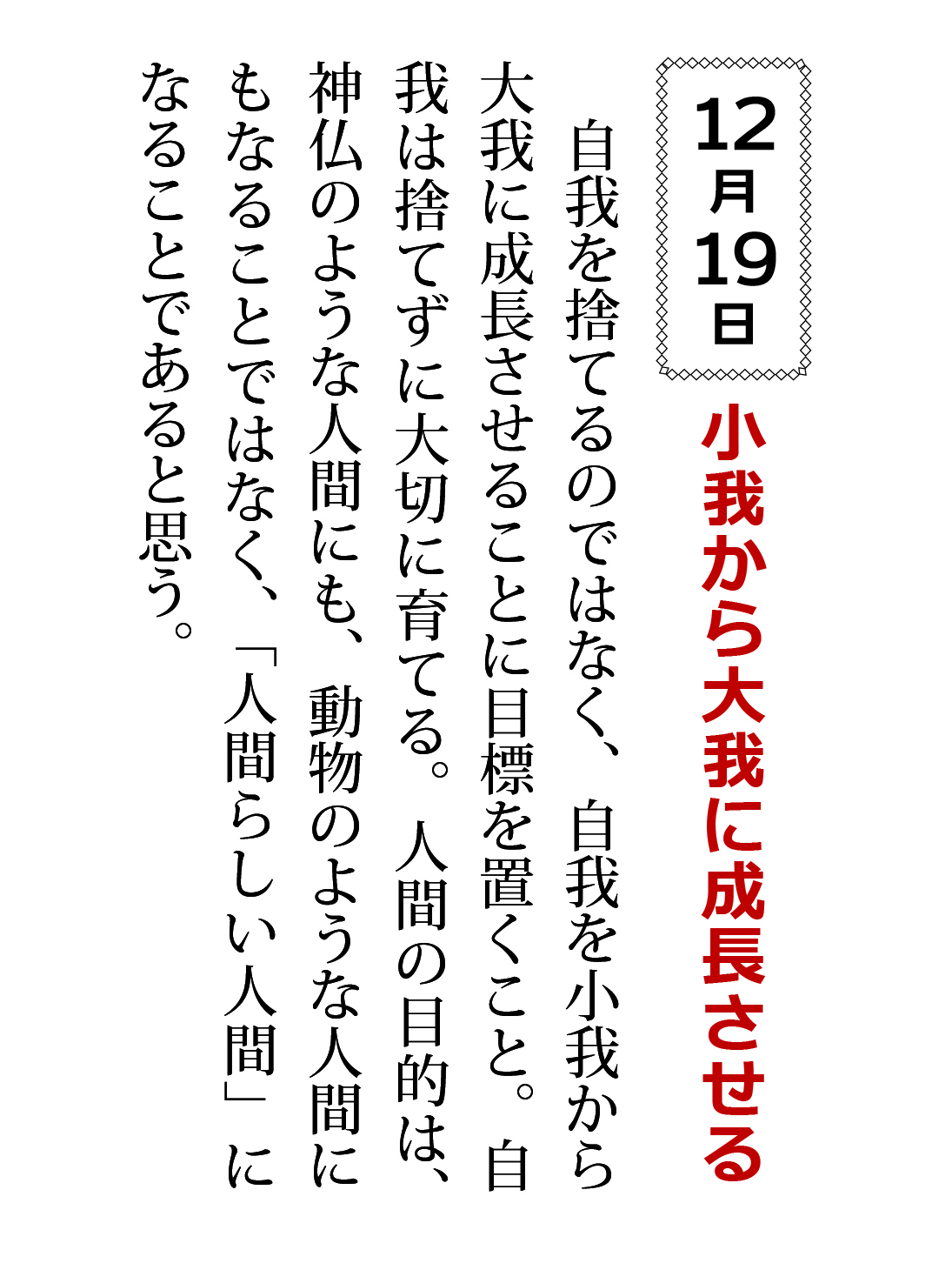 自我をすてるのではなく、自我を小我から大我に成長させることに目標を置くこと。自我は捨てずに大切に育てる。人間の目的は、神仏のような人間にも、動物のような人間にもなることではなく、「人間らしい人間」になることであると思う。
