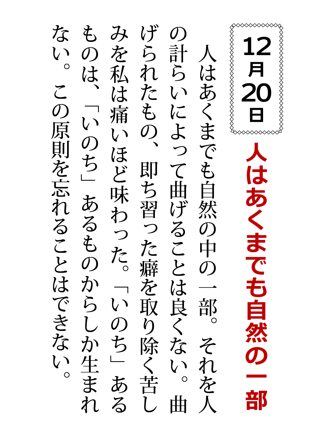 人はあくまでも自然の中の一部。それを人の計らいによって曲げることは良くない。曲げられたもの、即ち習った癖を取り除く苦しみを私は痛いほど味わった。「いのち」あるものは、「いのち」あるものしか生まれない。この原則を忘れることはできない。
