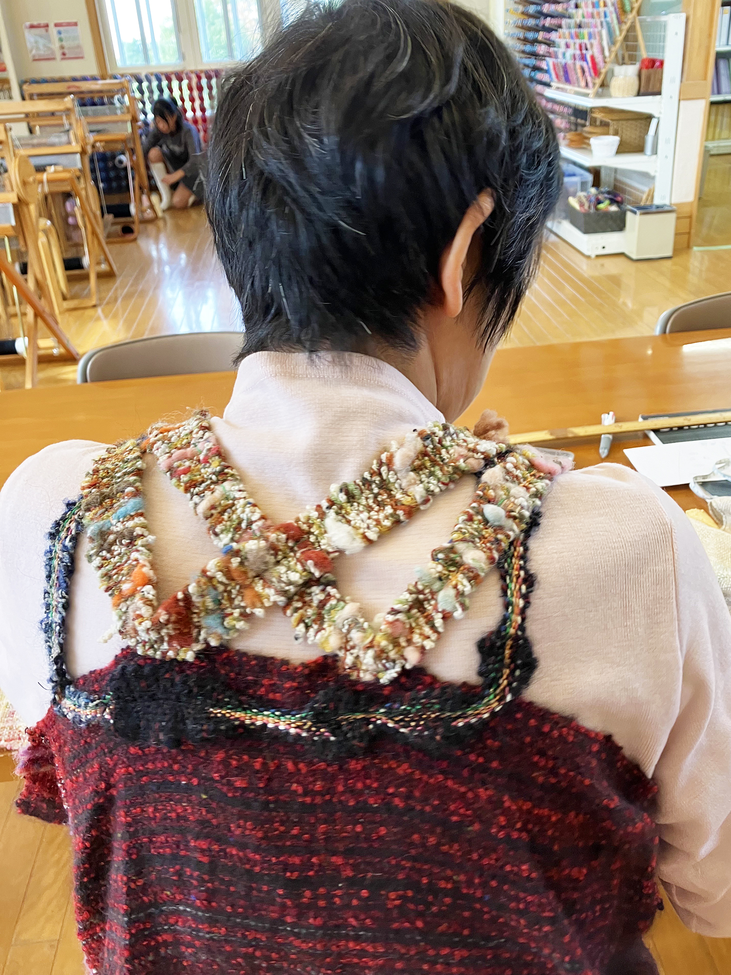あまりの可愛らしさに、後ろからパチリ!細幅で織った紐が、シックな色合いとの組み合わせで際立っています。