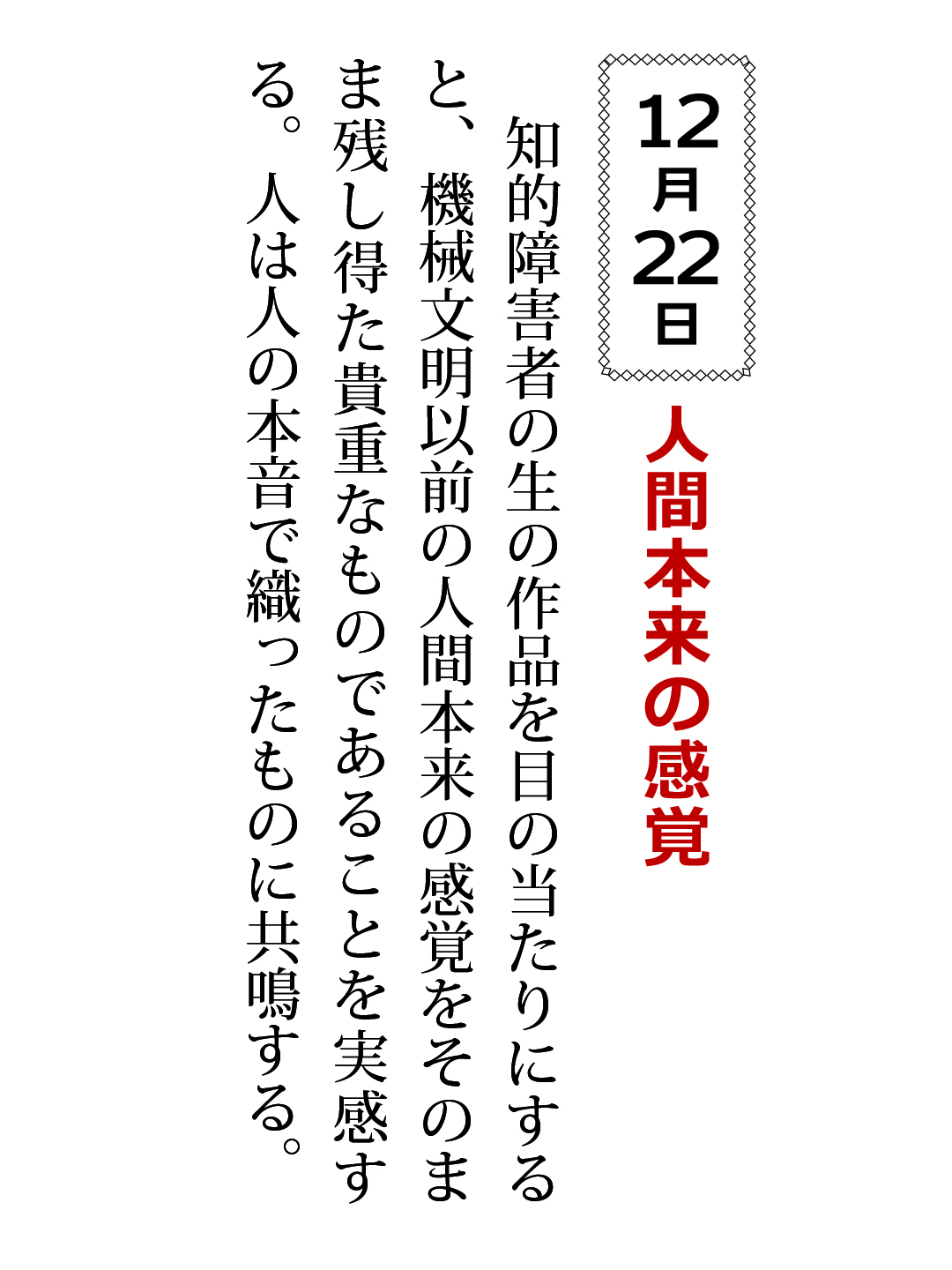知的障害者の生の作品を目の当たりにすると、機械文明以前の人間本来の感覚をそのまま残し得た貴重なものであることを実感する。人は人の本音で織ったものに共鳴する。