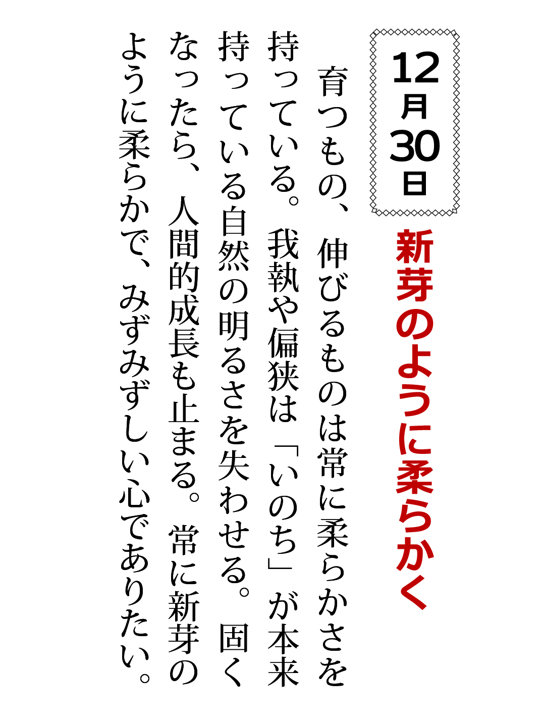 育つもの、伸びるものは常に柔らかさを持っている。我執や偏狭は「いのち」が本来持っている自然の明るさを失わせる。固くなったら、人間的成長も止まる。常に新芽のように柔らかで、みずみずしい心でありたい。