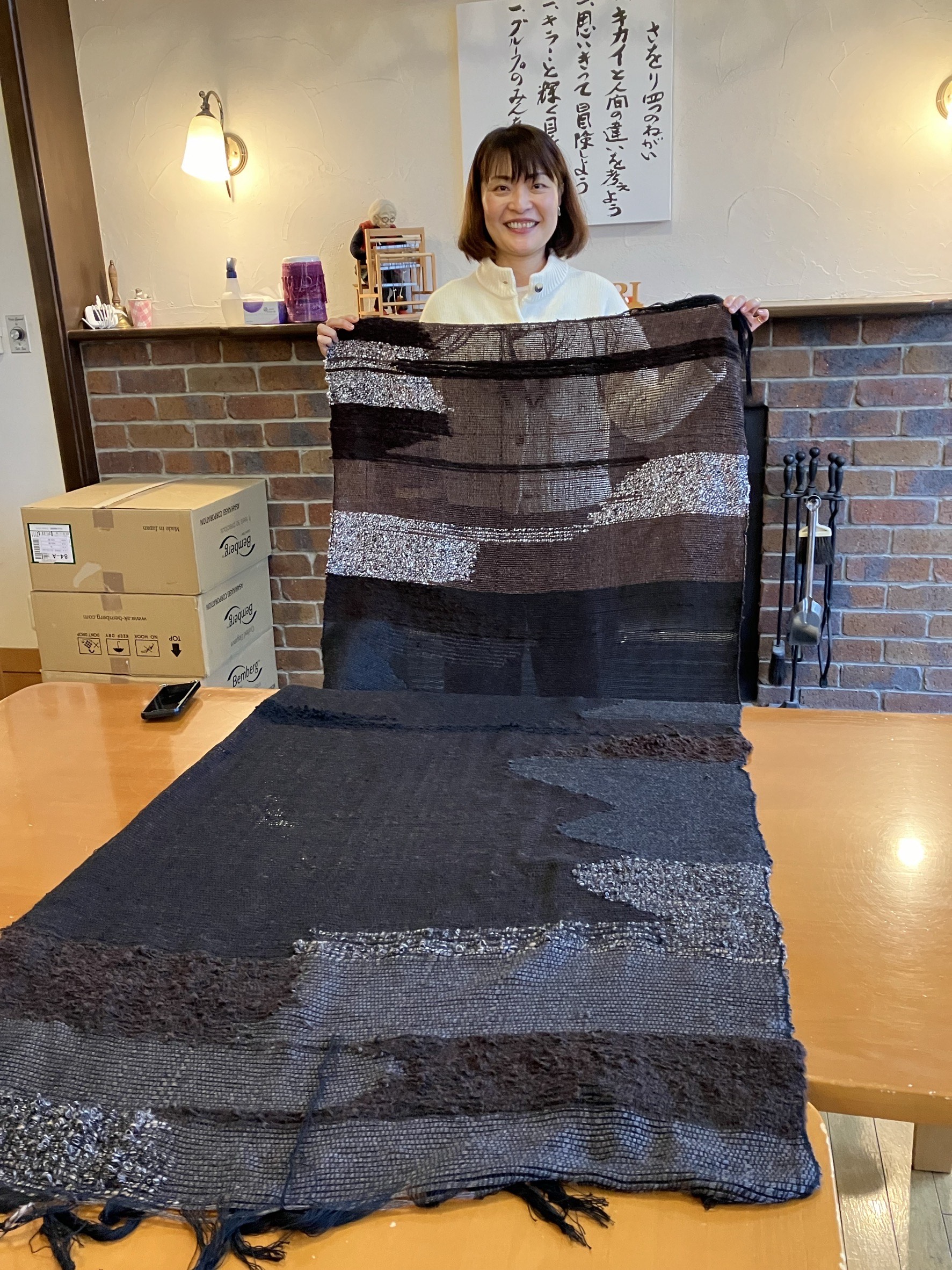 かつて織り人さん(今の塾生さん)として通ってくださっていましたが、今回約5年ぶりのご来館。お変わりなく素晴らしい創造力で、90㎝幅の大作を織り上げられました。