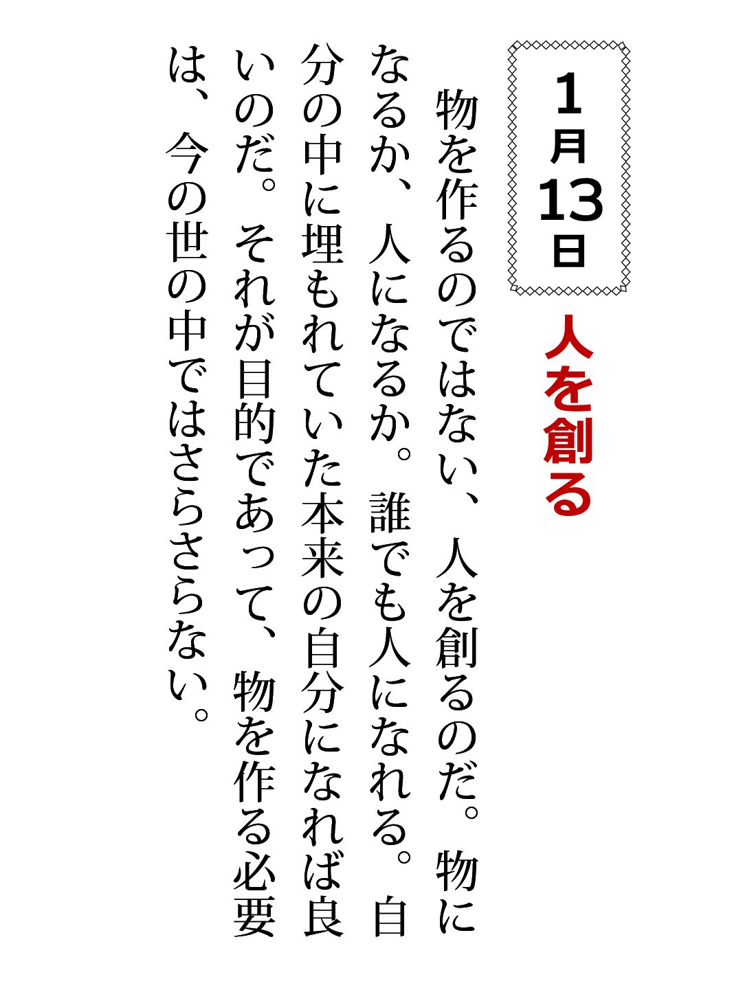 物を作るのではない、人を創るのだ。物になるか、人になるか。誰でも人になれる。自分の中に埋もれていた本来の自分になれば良いのだ。それが目的であって、物を作る必要は、今の世の中ではさらさらない。