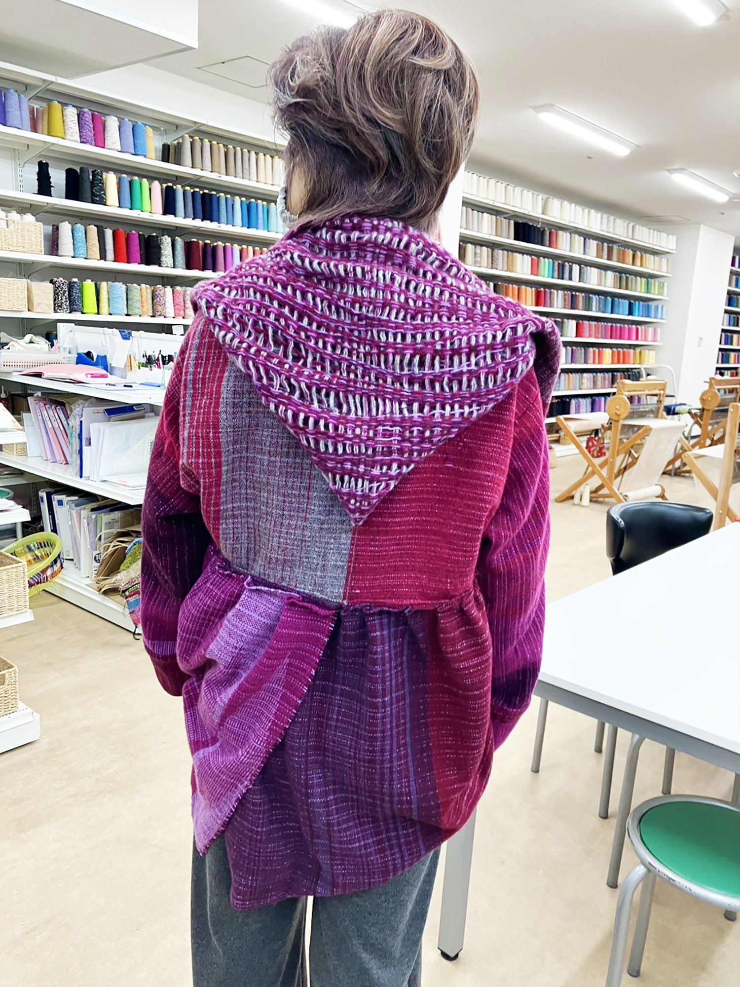フードの部分に荒く織った布を持ってきて、目を引く後ろ姿になりました。