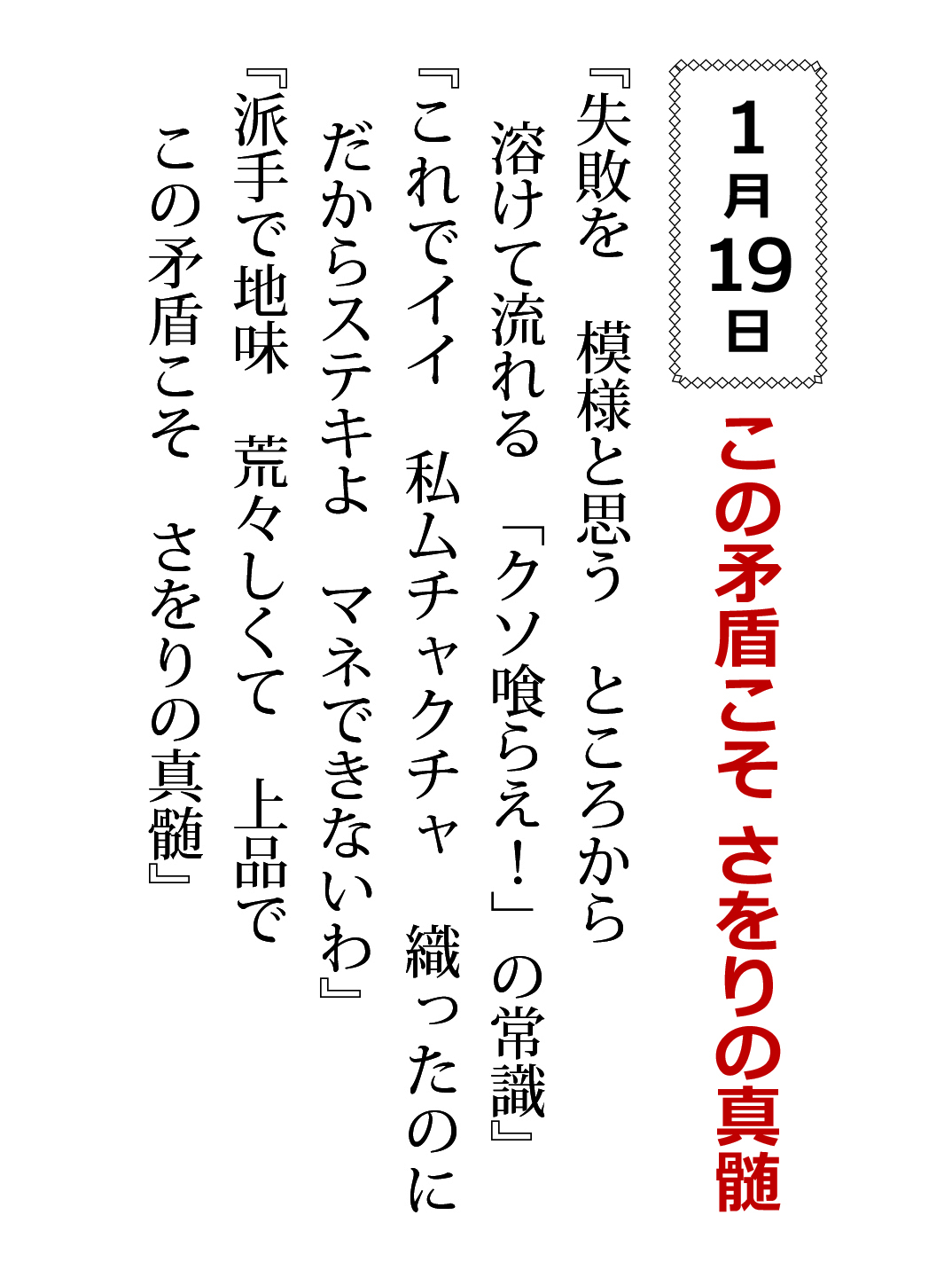 『失敗を 模様と思う ところから 溶けて流れる 「クソ喰らえ!」の常識』