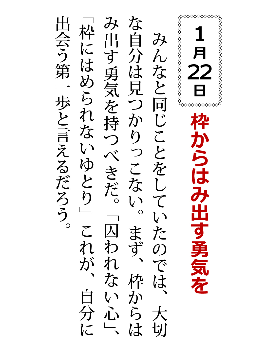 みんなと同じことをしていたのでは、大切な自分は見つかりっこない。まず、枠からはみ出す勇気を持つべきだ。「囚われない心」、「枠にはめられないゆとり」これが、自分に出会う第一歩と言えるだろう。