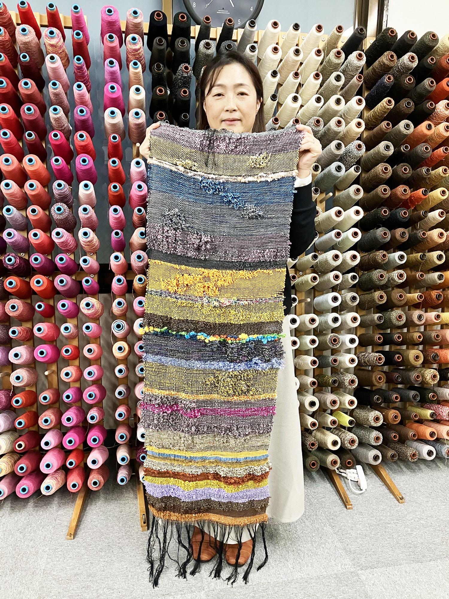 カリキュラムの『フワフワ織り』を目一杯楽しみながら、使う糸による見え方の違いという発見もされつ、織り上げられました。