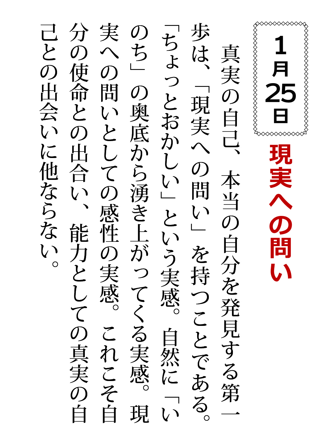 真実の自己、本当の自分を発見する第一歩は、「現実への問い」を持つことである。「ちょっとおかしい」という実感。自然に「いのち」の奥底から湧き上がってくる実感。現実への問いとしての感性の実感。これこそ自分の使命との出合い、能力としての真実の自己との出会いに他ならない。