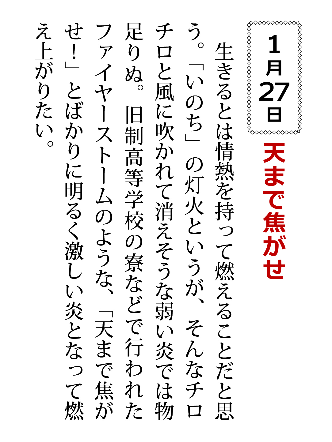 生きるとは情熱を持って燃えることだと思う。「いのち」の灯火というが、そんなチロチロと風に吹かれて消えそうな弱い炎では物足りぬ。旧制高等学校の寮などで行われたファイヤーストームのような、「天まで焦がせ!」とばかりに明るく激しい炎となって燃え上がりたい。