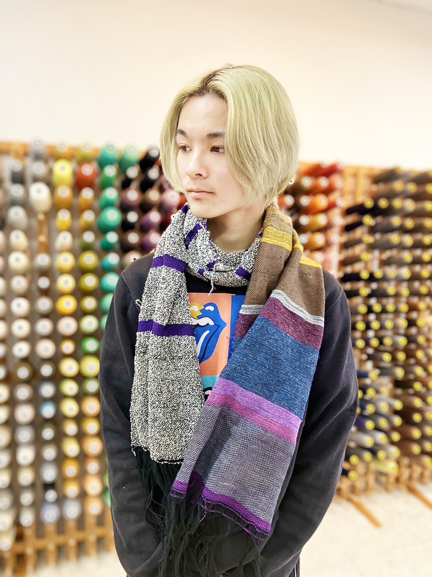 あらかじめ用意されたボビン糸巻きの糸でなく、ご自身で糸棚からひとつひとつヨコ糸を選ぶことを楽しんでいらっしゃる姿が印象的でした。
