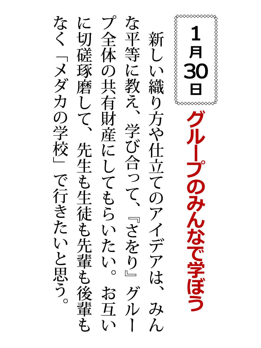 新しい織り方や仕立てのアイデアは、みんな平等に教え、学び合って、『さをり』グループ全体の共有財産にしてもらいたい。お互いに切磋琢磨して、先生も生徒も先輩も後輩もなく「メダカの学校」で行きたいと思う。