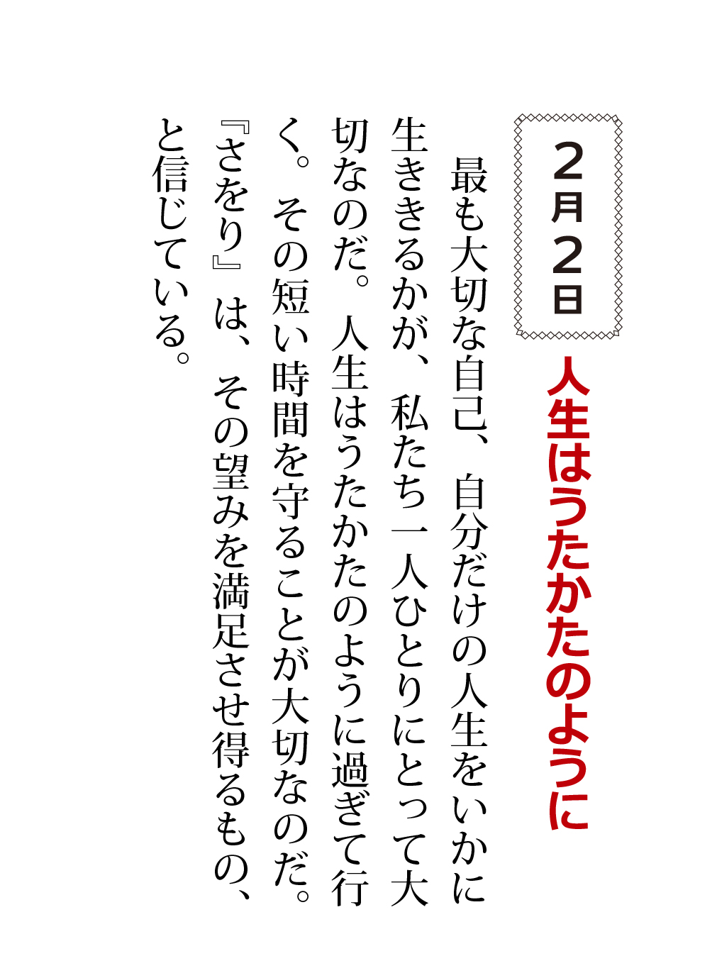 最も大切な自己、自分だけの人生をいかに生ききるかが、私たち一人ひとりにとって大切なのだ。人生はうたかたのように過ぎて行く。その短い時間を守ることが大切なのだ。『さをり』は、その望みを満足させ得るもの、と信じている。
