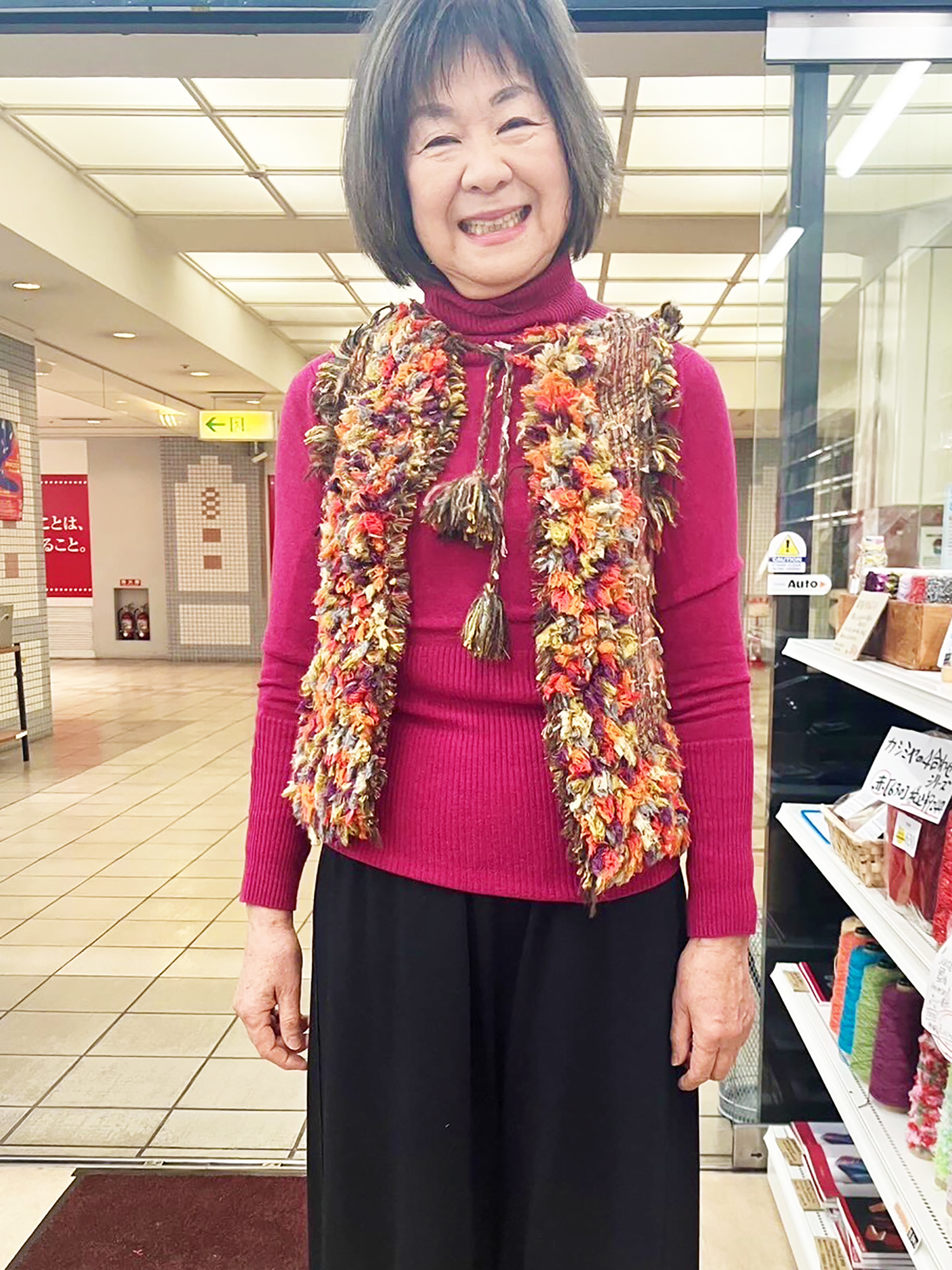 SAORI広島で冬になると大流行する『モジャベスト』は、何枚持っていても、また仕立てたくなるのだとか。今回は、社長特撰糸のぴゃむぴゃむやーんをふんだんに使って、可愛らしいボリューム感となりました。
