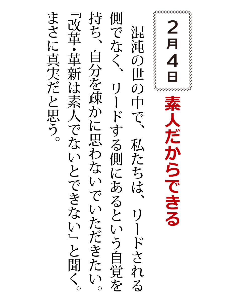 混沌の世の中で、私たちは、リードされる側でなく、リードする側にあるという自覚を持ち、自分を疎かに思わないでいただきたい。『改革・革新は素人でないとできない』と聞く。まさに真実だと思う。