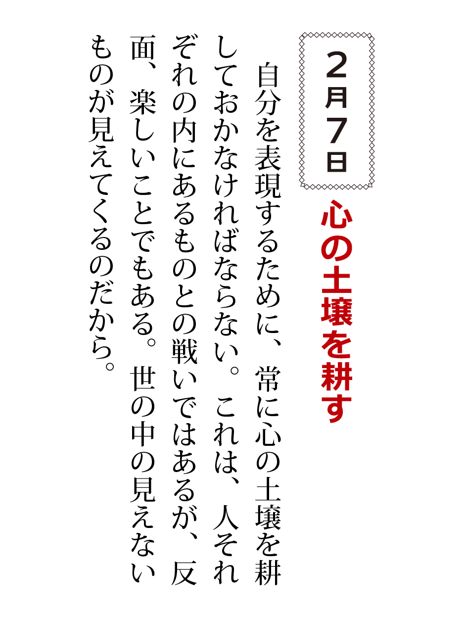 自分を表現するために、常に心の土壌を耕しておかなければならない。これは、人それぞれの内にあるものとの戦いではあるが、反面、楽しいことでもある。世の中の見えないものが見えてくるのだから。