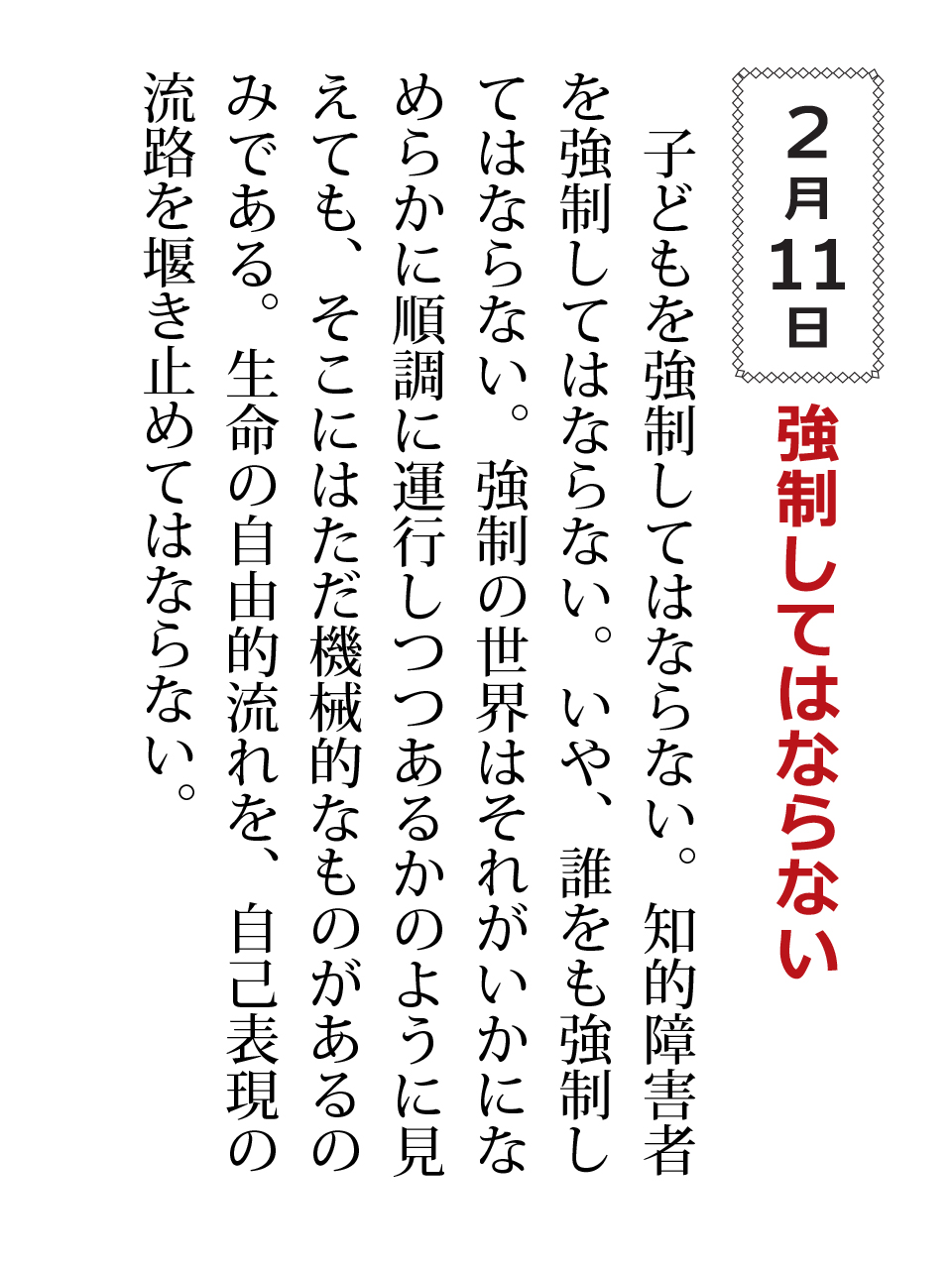 子どもを強制してはならない。知的障害者を強制してはならない。いや、誰をも強制してはならない。強制の世界はそれがいかになめらかに順調に運行しつつあるかのように見えても、そこにはただ機械的なものがあるのみである。生命の自由的流れを、自己表現の流路を堰き止めてはならない。