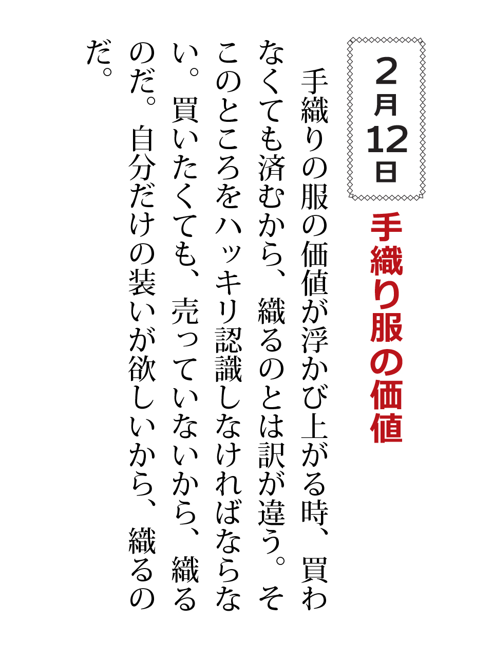 手織りの服の価値が浮かび上がる時、買わなくても済むから、織るのとは訳が違う。そこのところをハッキリ認識しなければならない。買いたくても、売っていないから、織るのだ。自分だけの装いが欲しいから、織るのだ。