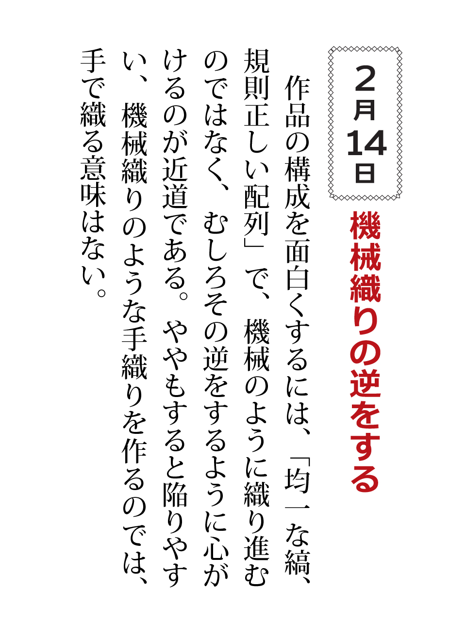 作品の構成を面白くするには、「均一な縞、規則正しい配列」で、機械のように織り進むのではなく、むしろその逆をするように心がけるのが近道である。ややもすると陥りやすい、機械織りのような手織りを作るのでは、手で織る意味はない。