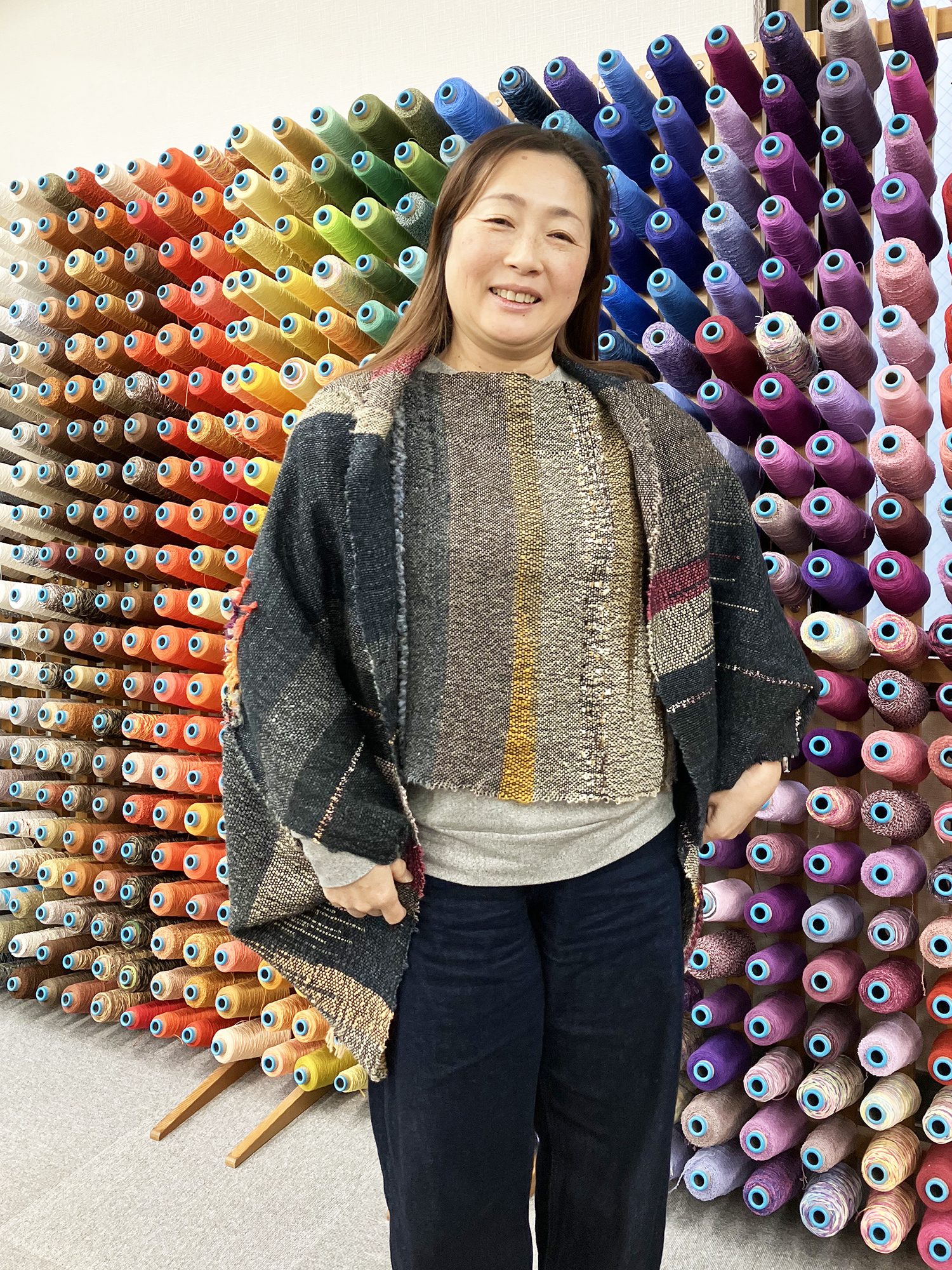 1枚の織り布で『ランチョンマットベスト』と『輪にするマーガレット』を仕立てて、セットアップでも、単品でも着れるようにされました。
