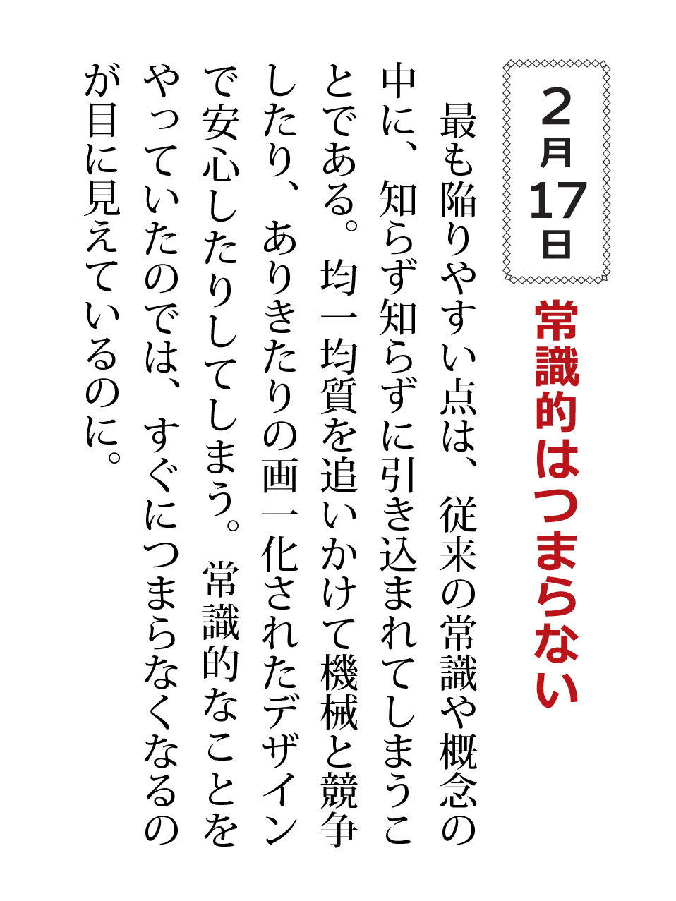 最も陥りやすい点は、従来の常識や概念の中に、知らず知らずに引き込まれてしまうことである。均一均質を追いかけて機械と競争したり、ありきたりの画一化されたデザインで安心したりしてしまう。常識的なことをやっていたのでは、すぐにつまらならなくなるのが目に見えているのに。